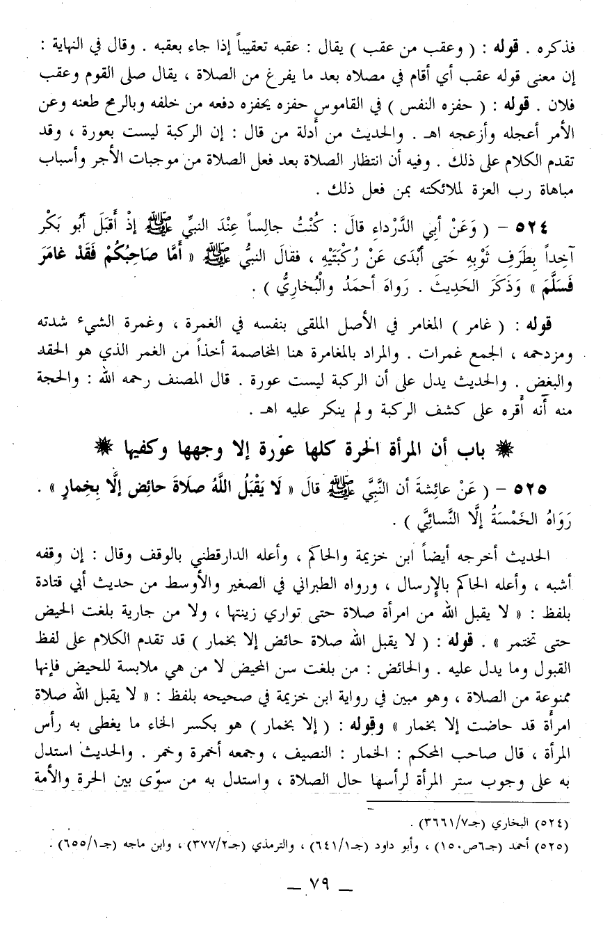 525 - (عَنْ عَائِشَةَ أَنَّ النَّبِيَّ - صَلَّى اللَّهُ عَلَيْهِ وَسَلَّمَ - قَالَ «لَا يَقْبَلُ اللَّهُ صَلَاةَ حَائِضٍ إلَّا بِخِمَارٍ» . رَوَاهُ الْخَمْسَةُ إلَّا النَّسَائِيّ) .