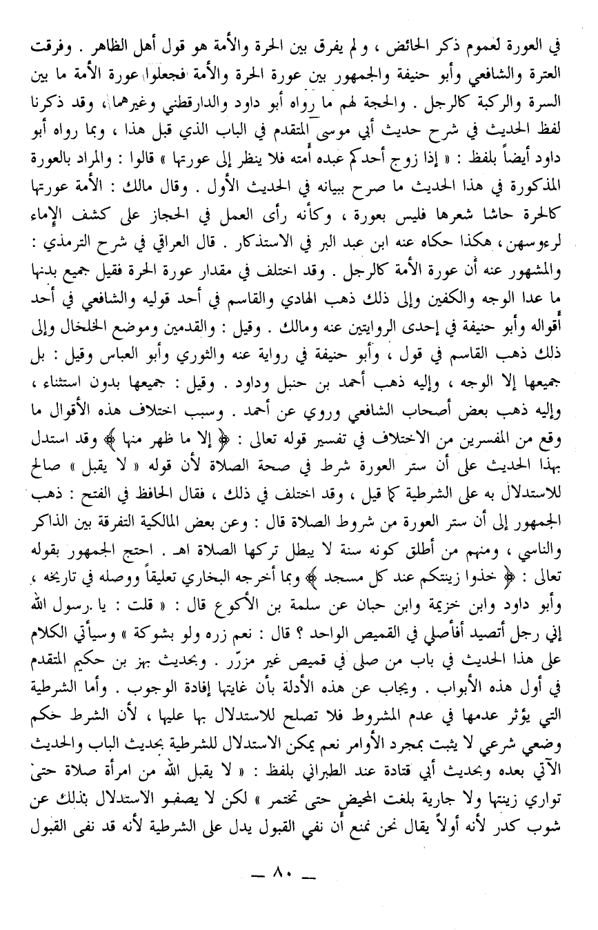 وَقَدْ اُخْتُلِفَ فِي مِقْدَارِ عَوْرَةِ الْحُرَّةِ فَقِيلَ جَمِيعُ بَدَنِهَا مَا عَدَا الْوَجْهَ وَالْكَفَّيْنِ وَإِلَى ذَلِكَ ذَهَبَ الْهَادِي وَالْقَاسِمُ فِي أَحَدِ قَوْلَيْهِ وَالشَّافِعِيُّ فِي أَحَدِ أَقْوَالِهِ وَأَبُو حَنِيفَةَ فِي إحْدَى الرِّوَايَتَيْنِ عَنْهُ وَمَالِكٌ. وَقِيلَ: وَالْقَدَمَيْنِ وَمَوْضِعِ الْخَلْخَالِ وَإِلَى ذَلِكَ ذَهَبَ الْقَاسِمُ فِي قَوْلٍ وَأَبُو حَنِيفَةَ فِي رِوَايَةٍ عَنْهُ وَالثَّوْرِيُّ وَأَبُو الْعَبَّاسِ وَقِيلَ: بَلْ جَمِيعُهَا إلَّا الْوَجْهَ، وَإِلَيْهِ ذَهَبَ أَحْمَدُ بْنُ حَنْبَلٍ وَدَاوُد. وَقِيلَ: جَمِيعُهَا بِدُونِ اسْتِثْنَاءٍ، وَإِلَيْهِ ذَهَبَ بَعْضُ أَصْحَابِ الشَّافِعِيِّ وَرُوِيَ عَنْ أَحْمَدَ. وَسَبَبُ اخْتِلَافِ هَذِهِ الْأَقْوَالِ مَا وَقَعَ مِنْ الْمُفَسِّرِينَ مِنْ الِاخْتِلَافِ فِي تَفْسِيرِ قَوْله تَعَالَى: {إِلا مَا ظَهَرَ مِنْهَا} [النور: 31] وَقَدْ اُسْتُدِلَّ بِهَذَا الْحَدِيثِ عَلَى أَنَّ سَتْرَ الْعَوْرَةِ شَرْطٌ فِي صِحَّةِ الصَّلَاةِ لِأَنَّ قَوْلَهُ " لَا يَقْبَلُ " صَالِحٌ لِلِاسْتِدْلَالِ بِهِ عَلَى الشَّرْطِيَّةِ كَمَا قِيلَ