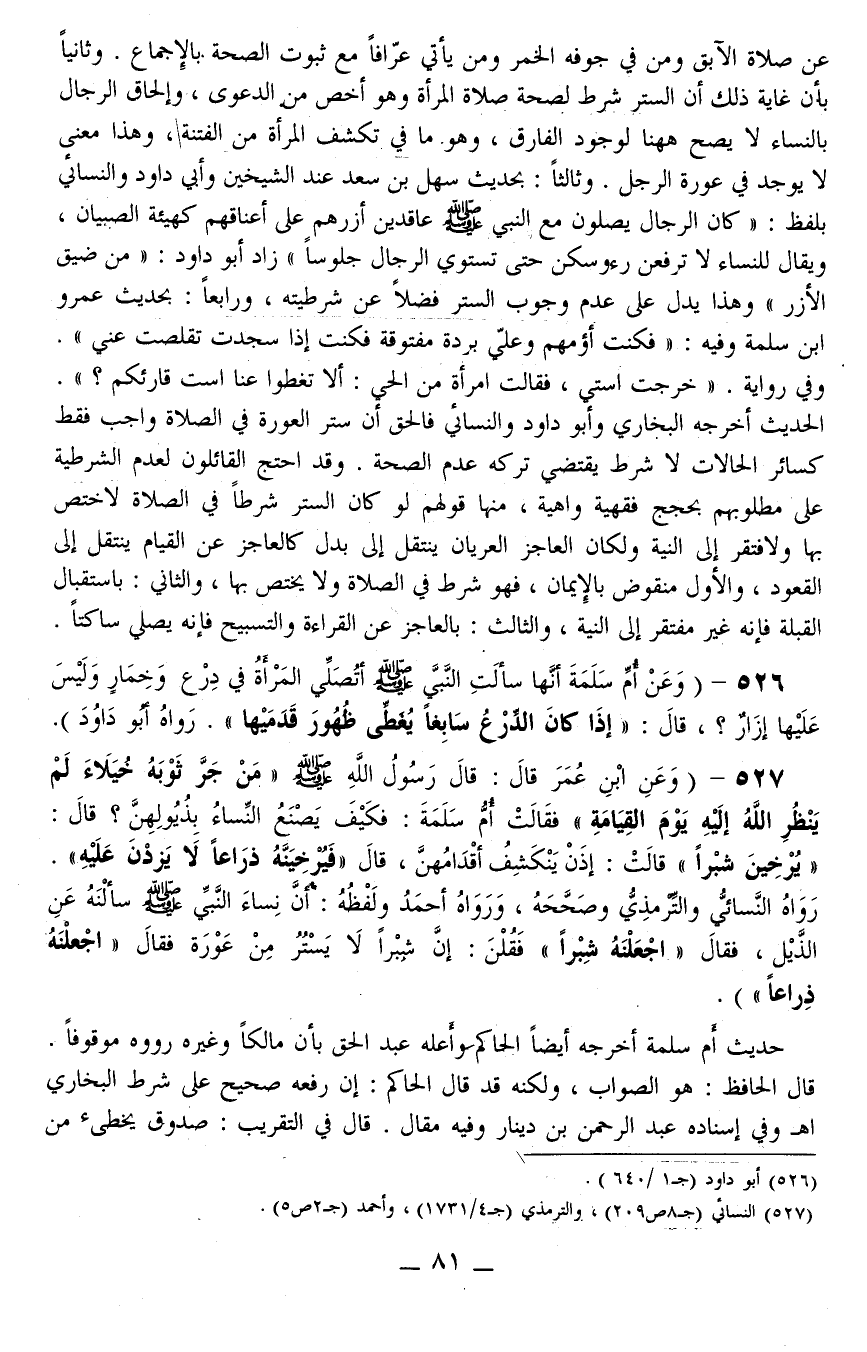 وَثَانِيًا بِأَنَّ غَايَةَ ذَلِكَ أَنَّ السَّتْرَ شَرْطٌ لِصِحَّةِ صَلَاةِ الْمَرْأَةِ، وَهُوَ أَخَصُّ مِنْ الدَّعْوَى، وَإِلْحَاقُ الرِّجَالِ بِالنِّسَاءِ لَا يَصِحُّ هَهُنَا لِوُجُودِ الْفَارِقِ، وَهُوَ مَا فِي تَكَشُّفِ الْمَرْأَةِ مِنْ الْفِتْنَةِ، وَهَذَا مَعْنَى لَا يُوجَدُ فِي عَوْرَةِ الرَّجُلِ. وَثَالِثًا: بِحَدِيثِ سَهْلِ بْنِ سَعْدٍ عِنْدَ الشَّيْخَيْنِ وَأَبِي دَاوُد وَالنَّسَائِيُّ بِلَفْظِ: «كَانَ الرِّجَالُ يُصَلُّونَ مَعَ النَّبِيِّ - صَلَّى اللَّهُ عَلَيْهِ وَسَلَّمَ - عَاقِدِينَ أُزُرَهُمْ عَلَى أَعْنَاقِهِمْ كَهَيْئَةِ الصِّبْيَانِ، وَيُقَالُ لِلنِّسَاءِ لَا تَرْفَعْنَ رُءُوسَكُنَّ حَتَّى تَسْتَوِيَ الرِّجَالُ جُلُوسًا» زَادَ أَبُو دَاوُد: «مِنْ ضِيقِ الْأُزُرِ» وَهَذَا يَدُلُّ عَلَى عَدَمِ وُجُوبِ السَّتْرِ فَضْلًا عَنْ شَرْطِيَّتِهِ، وَرَابِعًا: بِحَدِيثِ عَمْرِو بْنِ سَلَمَةَ وَفِيهِ «فَكُنْتُ أَؤُمُّهُمْ وَعَلَيَّ بُرْدَةٌ مَفْتُوقَةٌ فَكُنْتُ إذَا سَجَدْت تَقَلَّصَتْ عَنِّي»