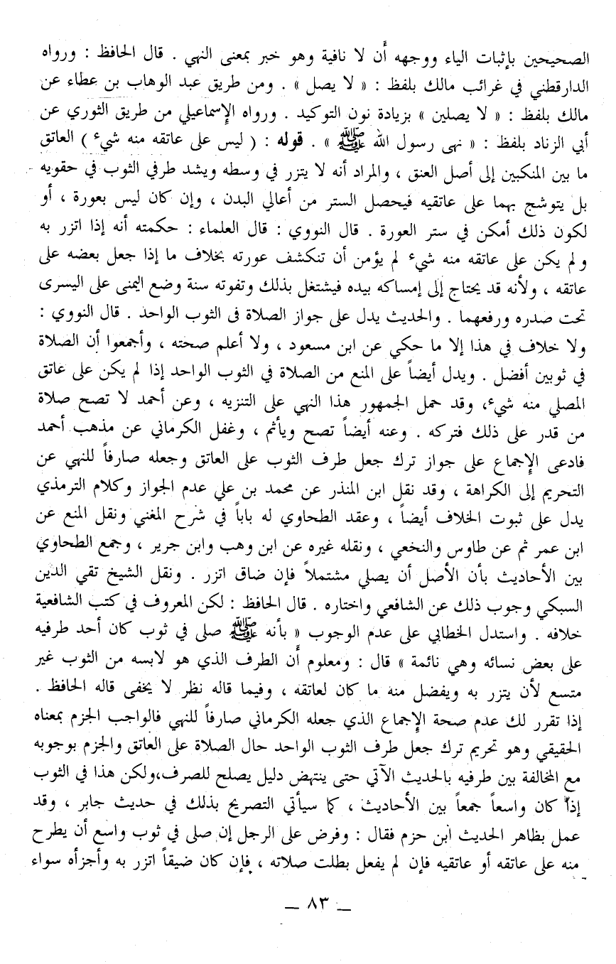 وَنَقَلَ الشَّيْخُ تَقِيُّ الدِّينِ السُّبْكِيُّ وُجُوبَ ذَلِكَ عَنْ الشَّافِعِيِّ وَاخْتَارَهُ. قَالَ الْحَافِظُ: لَكِنْ الْمَعْرُوفُ فِي كُتُبِ الشَّافِعِيَّةِ خِلَافُهُ. وَاسْتَدَلَّ الْخَطَّابِيِّ عَلَى عَدَمِ الْوُجُوبِ «بِأَنَّهُ - صَلَّى اللَّهُ عَلَيْهِ وَسَلَّمَ - صَلَّى فِي ثَوْبٍ كَانَ أَحَدُ طَرَفَيْهِ عَلَى بَعْضِ نِسَائِهِ، وَهِيَ نَائِمَةٌ» قَالَ: وَمَعْلُومٌ أَنَّ الطَّرَفَ الَّذِي هُوَ لَابِسُهُ مِنْ الثَّوْبِ غَيْرُ مُتَّسِعٍ؛ لَأَنْ يَتَّزِرَ بِهِ، وَيَفْضُلَ مِنْهُ مَا كَانَ لِعَاتِقِهِ، وَفِيمَا قَالَهُ نَظَرٌ لَا يَخْفَى قَالَهُ الْحَافِظُ. إذَا تَقَرَّرَ لَك عَدَمُ صِحَّةِ الْإِجْمَاعِ الَّذِي جَعَلَهُ الْكَرْمَانِيُّ صَارَ لِلنَّهْيِ فَالْوَاجِبُ الْجَزْمُ بِمَعْنَاهُ الْحَقِيقِيُّ وَهُوَ تَحْرِيمُ تَرْكِ جَعْلِ طَرَفِ الثَّوْبِ الْوَاحِدِ حَالَ الصَّلَاةِ عَلَى الْعَاتِقِ وَالْجَزْمِ بِوُجُوبِهِ مَعَ الْمُخَالَفَةِ بَيْنَ طَرَفَيْهِ بِالْحَدِيثِ الْآتِي حَتَّى يَنْتَهِضَ دَلِيلٌ يَصْلُحُ لِلصَّرْفِ، وَلَكِنْ هَذَا فِي الثَّوْبِ إذَا كَانَ وَاسِعًا جَمْعًا بَيْنَ الْأَحَادِيثِ، كَمَا سَيَأْتِي التَّصْرِيحُ بِذَلِكَ فِي حَدِيثِ جَابِرٍ