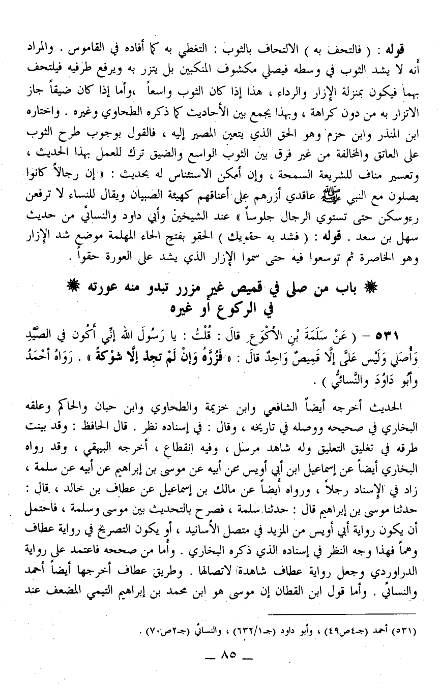 531 - (عَنْ سَلَمَةَ بْنِ الْأَكْوَعِ قَالَ: قُلْت: يَا رَسُولَ اللَّهِ إنِّي أَكُونُ فِي الصَّيْدِ وَأُصَلِّي وَلَيْسَ عَلَيَّ إلَّا قَمِيصٌ وَاحِدٌ قَالَ: «فَزُرَّهُ وَإِنْ لَمْ تَجِدْ إلَّا شَوْكَةً» . رَوَاهُ أَحْمَدُ وَأَبُو دَاوُد وَالنَّسَائِيُّ) .