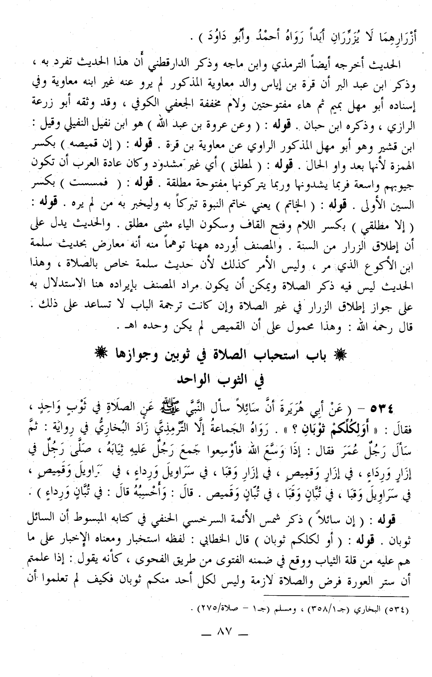 534 - (عَنْ أَبِي هُرَيْرَةَ «أَنَّ سَائِلًا سَأَلَ النَّبِيَّ - صَلَّى اللَّهُ عَلَيْهِ وَسَلَّمَ - عَنْ الصَّلَاةِ فِي ثَوْبٍ وَاحِدٍ، فَقَالَ: أَوَلِكُلِّكُمْ ثَوْبَانِ؟» . رَوَاهُ الْجَمَاعَةُ إلَّا التِّرْمِذِيَّ زَادَ الْبُخَارِيُّ فِي رِوَايَةٍ: ثُمَّ سَأَلَ رَجُلٌ عُمَرَ فَقَالَ: إذَا وَسَّعَ اللَّهُ فَأَوْسِعُوا جَمَعَ رَجُلٌ عَلَيْهِ ثِيَابَهُ، صَلَّى رَجُلٌ فِي إزَارٍ وَرِدَاءٍ، فِي إزَارٍ وَقَمِيصٍ، فِي إزَارٍ وَقَبَا، فِي سَرَاوِيلَ وَرِدَاءٍ، فِي سَرَاوِيلَ وَقَمِيصٍ، فِي سَرَاوِيلَ وَقَبَا، فِي تُبَّانٍ وَقَبَا، فِي تُبَّانٍ وَقَمِيصٍ. قَالَ: وَأَحْسَبُهُ قَالَ: فِي تُبَّانٍ وَرِدَاءٍ) .