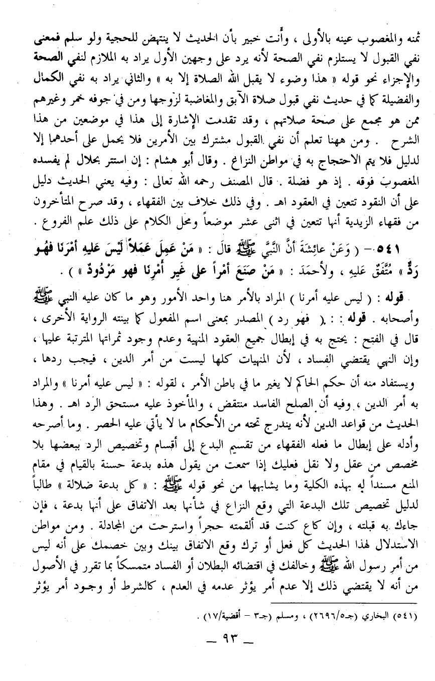 541 - (وَعَنْ عَائِشَةَ أَنَّ النَّبِيَّ - صَلَّى اللَّهُ عَلَيْهِ وَسَلَّمَ - قَالَ: «مَنْ عَمِلَ عَمَلًا لَيْسَ عَلَيْهِ أَمْرُنَا فَهُوَ رَدٌّ» مُتَّفَقٌ عَلَيْهِ، وَلِأَحْمَدَ: «مَنْ صَنَعَ أَمْرًا عَلَى غَيْرِ أَمْرِنَا فَهُوَ مَرْدُودٌ» .