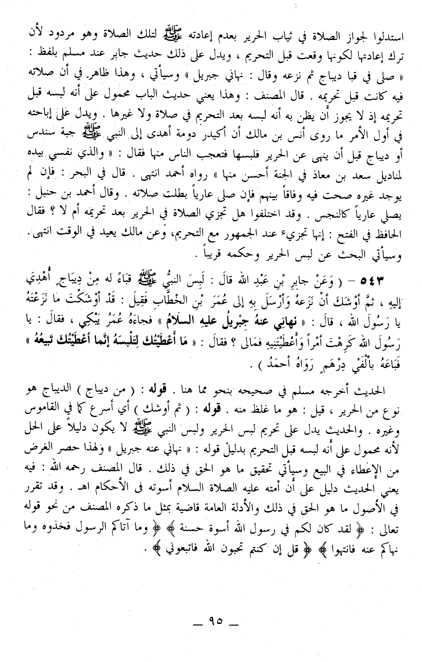 543 - (وَعَنْ جَابِرِ بْنِ عَبْدِ اللَّهِ قَالَ: «لَبِسَ النَّبِيُّ - صَلَّى اللَّهُ عَلَيْهِ وَسَلَّمَ - قَبَاءً لَهُ مِنْ دِيبَاجٍ أُهْدِيَ إلَيْهِ، ثُمَّ أَوْشَكَ أَنْ نَزَعَهُ وَأَرْسَلَ بِهِ إلَى عُمَرَ بْنِ الْخَطَّابِ فَقِيلَ: قَدْ أَوْشَكْت مَا نَزَعْته يَا رَسُولَ اللَّهِ، قَالَ: نَهَانِي عَنْهُ جِبْرِيلُ فَجَاءَهُ عُمَرُ يَبْكِي، فَقَالَ: يَا رَسُولَ اللَّهِ كَرِهْت أَمْرًا وَأَعْطَيْتَنِيهِ فَمَا لِي؟ فَقَالَ: مَا أَعْطَيْتُك لِتَلْبَسَهُ إنَّمَا أَعْطَيْتُك تَبِيعُهُ فَبَاعَهُ بِأَلْفَيْ دِرْهَمٍ» رَوَاهُ أَحْمَدُ) . الْحَدِيثُ أَخْرَجَهُ مُسْلِمٌ فِي صَحِيحِهِ بِنَحْوٍ مِمَّا هُنَا.
