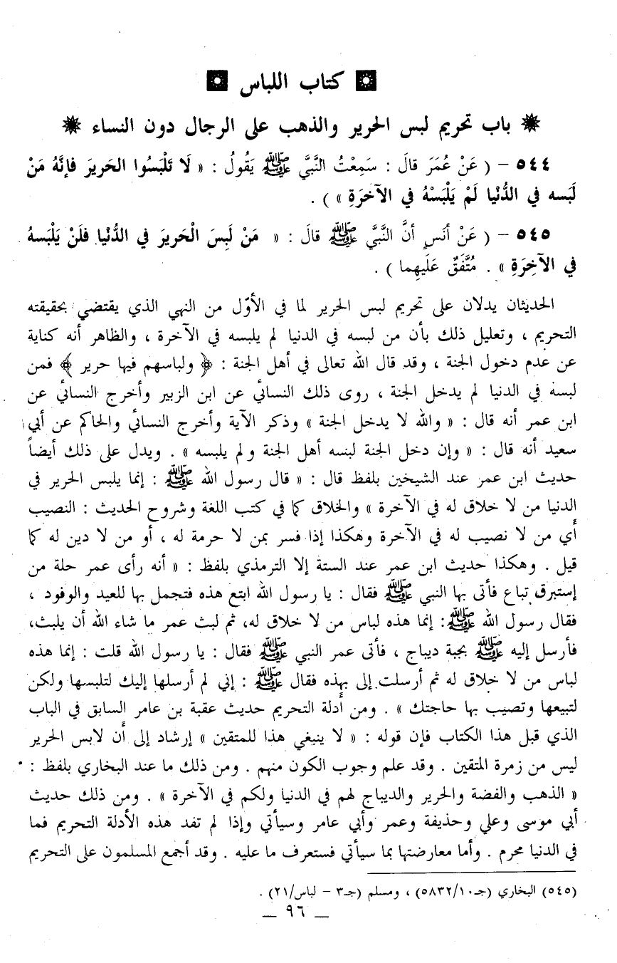 544 - عَنْ عُمَرَ قَالَ: سَمِعْت النَّبِيَّ - صَلَّى اللَّهُ عَلَيْهِ وَسَلَّمَ - يَقُولُ: «لَا تَلْبَسُوا الْحَرِيرَ فَإِنَّهُ مَنْ لَبِسَهُ فِي الدُّنْيَا لَمْ يَلْبَسْهُ فِي الْآخِرَةِ» .