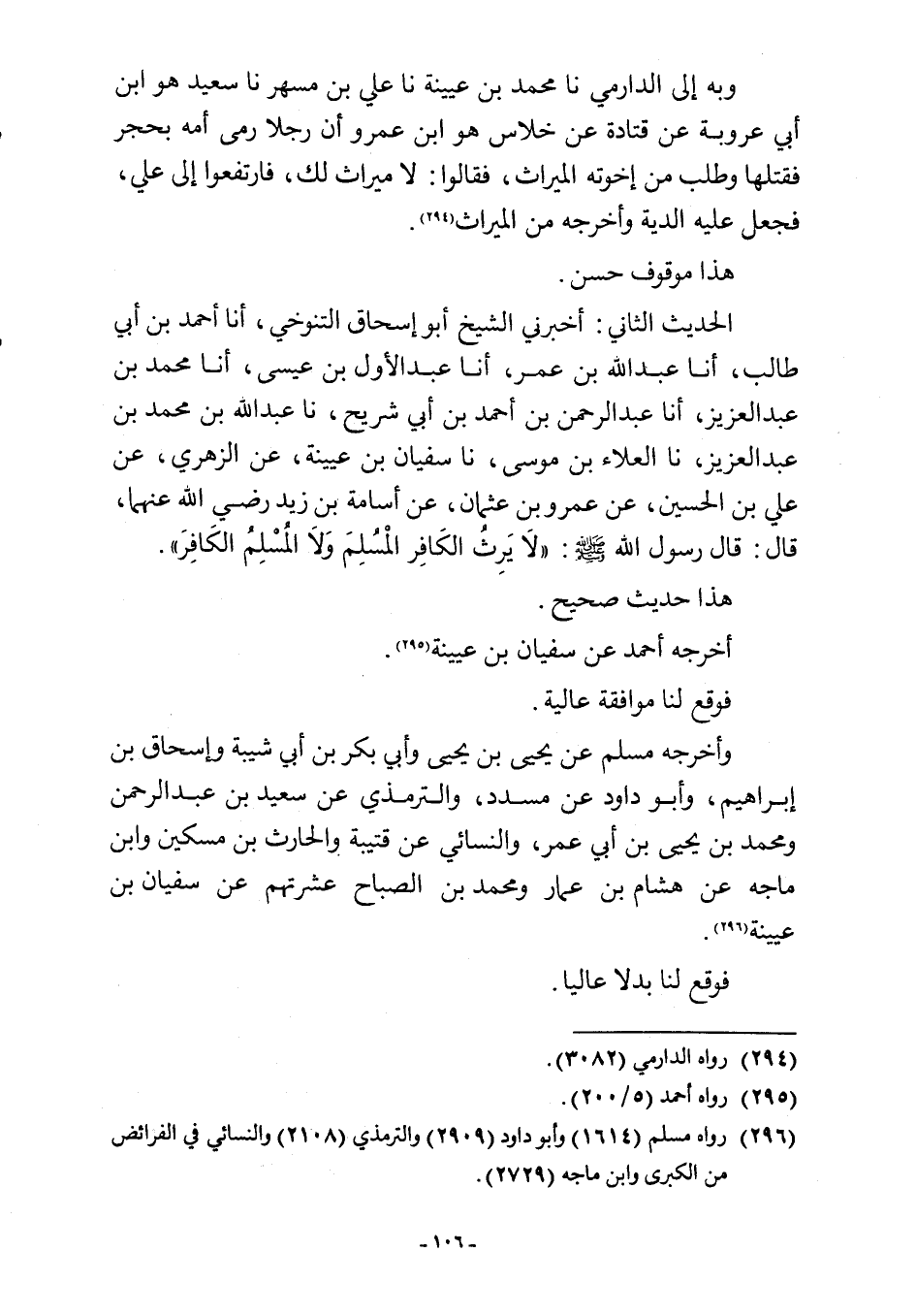 الحديث الثاني: أخبرني الشيخ أبو إسحاق التنوخي، أنا أحمد بن أبي طالب، أنا عبد اللَّه بن عمر، أنا عبد الأول بن عيسى، أنا محمد بن عبد العزيز، أنا عبد الرحمن بن أحمد بن أبي شريح، نا عبد اللَّه بن محمد بن عبد العزيز، نا العلاء بن موسى، نا سفيان بن عيينة، عن الزهري، عن علي بن الحسين، عن عمرو بن عثمان، عن أسامة بن زيد رضي اللَّه عنهما، قال: قال رسول اللَّه -صلى اللَّه عليه وسلم-: "لَا يَرِثُ الكَافِر المْسُلِمَ وَلَا المُسْلِمُ الكَافِرَ".