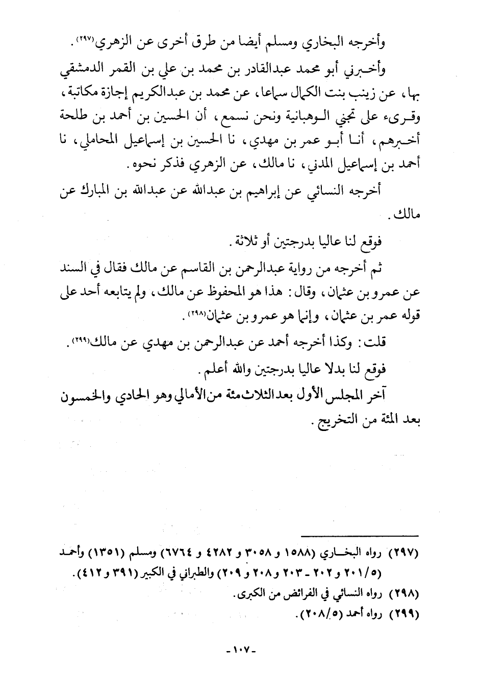 وأخبرني أبو محمد عبد القادر بن محمد بن علي بن القمر الدمشقي بها، عن زينب بنت الكمال سماعا، عن محمد بن عبد الكريم إجازة مكاتبة، وقرئ على تجني الوهبانية ونحن نسمع، أن الحسين بن أحمد بن طلحة أخبرهم، أنا أبو عمر بن مهدي، نا الحسين بن إسماعيل المحاملي، نا أحمد بن إسماعيل المدني، نا مالك، عن الزهري فذكر نحوه.