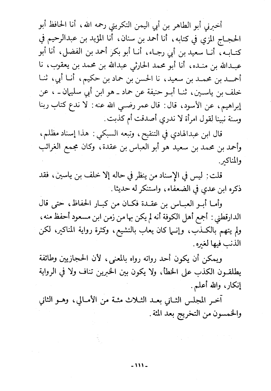 أخبرني أبو الطاهر بن أبي اليمن التكريتي رحمه اللَّه، أنا الحافظ أبو الحجاج المزي في كتابه، أنا أحمد بن سنان، أنا المؤيد بن عبد الرحيم في كتابه، أنا سعيد بن أبي رجاء، أنا أبو بكر أحمد بن الفضل، أنا أبو عبد اللَّه بن منده، أنا أبو محمد الحارثي عبد اللَّه بن محمد بن يعقوب، نا أحمد بن محمد بن سعيد، نا الحسن بن حماد بن حكيم، أنا أبي، ثنا خلف بن ياسين, ثنا أبو حنيفة عن حماد -هو ابن أبي سليمان-، عن إبراهيم، عن الأسود، قال: قال عمر رضي اللَّه عنه: لا ندع كتاب ربنا وسنة نبينا لقول امرأة لا ندري أصدقت أم كذبت.