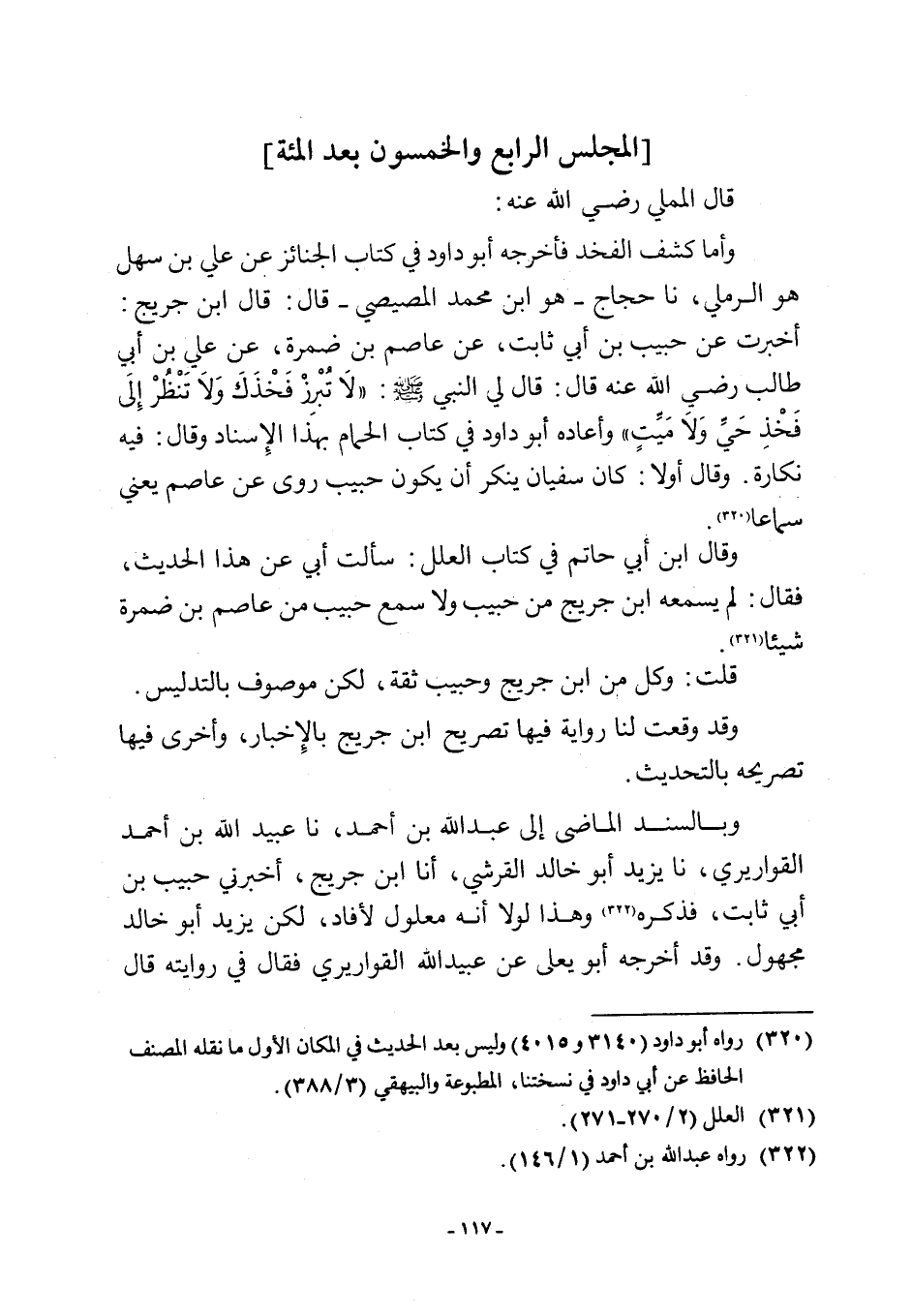 وأما كشف الفخد فأخرجه أبو داود في كتاب الجنائز بن علي بن سهل هو الرملي، نا حجاج -هو ابن محمد المصيصي- قال: قال ابن جريج: أخبرت عن حبيب بن أبي ثابت، عن عاصم بن ضمرة، عن علي بن أبي طالب رضي اللَّه عنه قال: قال لي النبي -صلى اللَّه عليه وسلم-: "لَا تبْرزْ فَخْذَكَ وَلَا تَنْظُرْ إِلى فَخْذِ حَيِّ وَلَا مَيِّتٍ" وأعاده أبو داود في كتاب الحمام بهذا الإِسناد وقال: فيه نكارة. وقال أولا: كان سفيان ينكر أن يكون حبيب روى عن عاصم يعني سماعا (¬320).