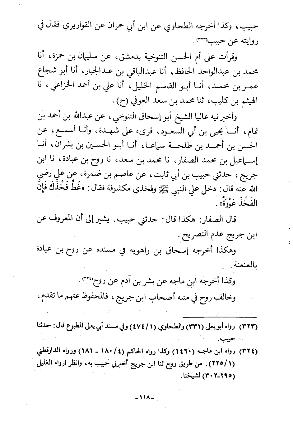وأخبرنيه عاليا الشيخ أبو إسحاق التنوخي، عن عبد اللَّه بن أحمد بن تمام، أنا يحيى بن أبي السعود، قرئ على شهدة، وأنا أسمع، عن الحسن بن أحمد بن طلحة سماعا، أنا أبو الحسين بن بشران، أنا إسماعيل بن محمد الصفار، نا محمد بن سعد، نا روح بن عبادة، نا ابن جريج، حدثني حبيب بن أبي ثابت، عن عاصم بن ضمرة، بن علي رضي اللَّه عنه قال: دخل علي النبي -صلى اللَّه عليه وسلم- وفخذي مكشوفة فقال: "غَطِّ فَخْذَكَ فَإِنَّ الفَخْذَ عَوْرَةٌ".