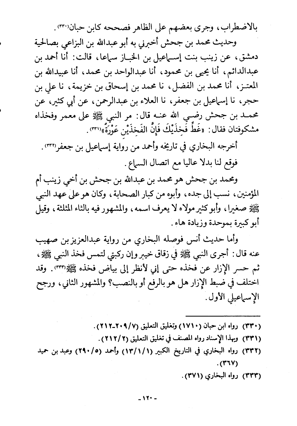 وحديث محمد بن جحش أخبرني به أبو عبد اللَّه بن البزاعي بصالحية دمشق، عن زينب بنت إسماعيل بن الخباز سماعا، قالت: أنا أحمد بن عبد الدائم، أنا يحيى بن محمود، أنا عبد الواحد بن محمد، أنا عبيد اللَّه بن المعتز، أنا محمد بن الفضل، نا محمد بن إسحاق بن خزيمة، نا علي بن حجر، نا إسماعيل بن جعفر، نا العلاء بن عبد الرحمن، عن أبي كثير، عن محمد بن جحش رضي اللَّه عنه قال: مر النبي -صلى اللَّه عليه وسلم- على معمر وفخذاه مشكوفتان فقال: "غَطِّ فَخِذَيْكَ فَإِنَّ الفَخِذَيْنِ عَوْرَةٌ" (¬331).