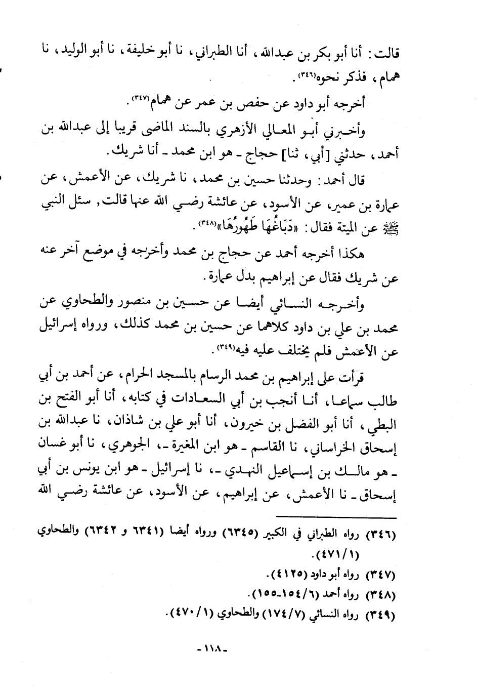 قال أحمد: وحدثنا حسين بن محمد، نا شريك، عن الأعمش، عن عمارة بن عمير، عن الأسود، عن عائشة رضي اللَّه عنها قالت، سئل النبي -صلى اللَّه عليه وسلم- عن الميتة فقال: "دَبَاغُهَا طَهُورُهَا" (¬348).