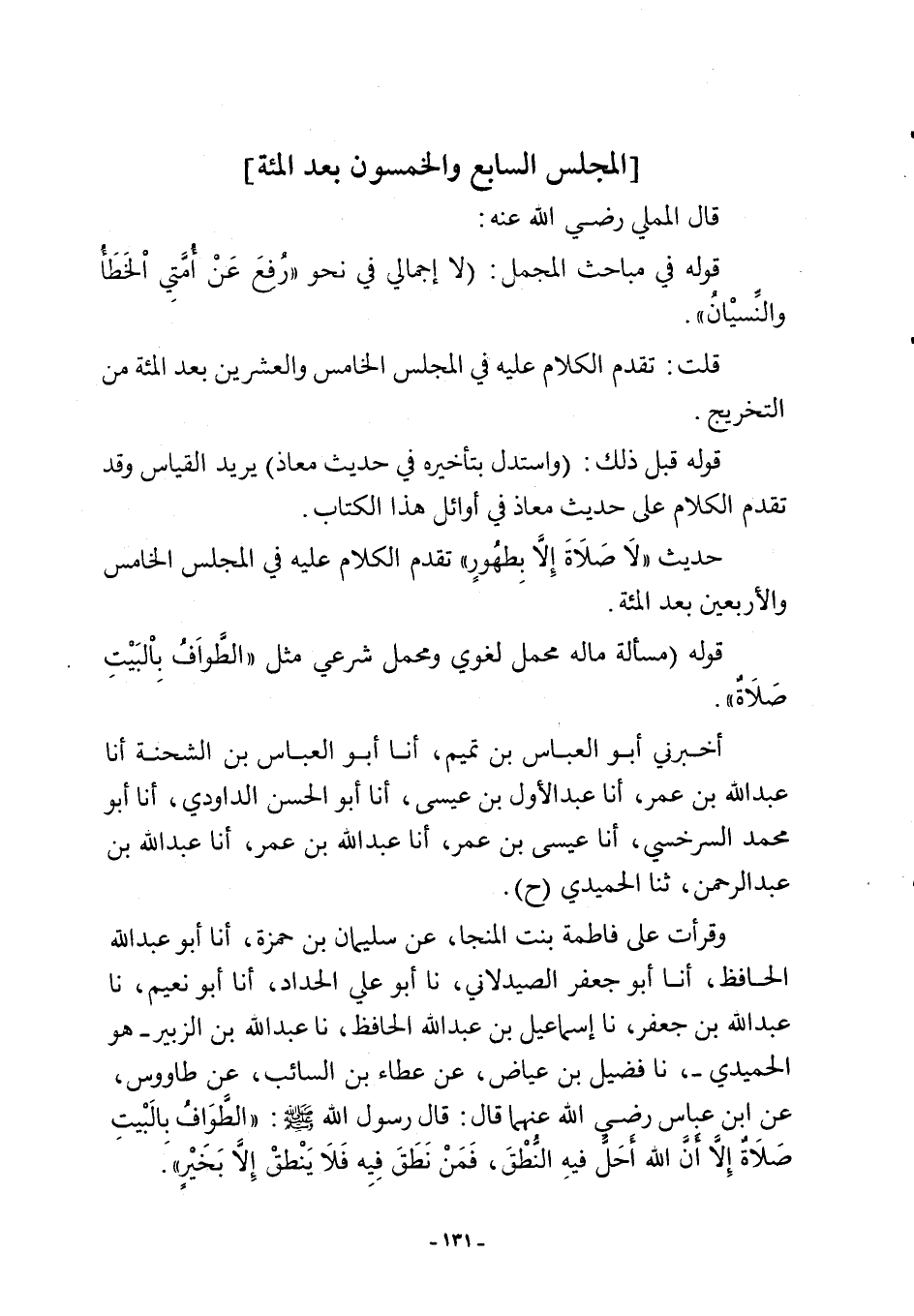 وقرأت على فاطمة بنت المنجا، عن سليمان بن حمزة، أنا أبو عبد اللَّه الحافظ، أنا أبو جعفر الصيدلاني، نا أبو علي الحداد، أنا أبو نعيم، نا عبد اللَّه بن جعفر، نا إسماعيل بن عبد اللَّه الحافظ، نا عبد اللَّه بن الزبير -هو الحميدي-، نا فضيل بن عياض، عن عطاء بن السائب، عن طاووس، عن ابن عباس رضىٍ اللَّه عنهما قال: قال رسول اللَّه -صلى اللَّه عليه وسلم-: "الطَّوِافُ بِالبَيْتِ صَلَاةٌ إِلَّا أَنَّ اللَّه أَحَلَّ فيهِ النُّطْقَ، فَمَنْ نَطَقَ فِيه فَلَا يَنْطقْ إِلَّا بَخيْرٍ".
