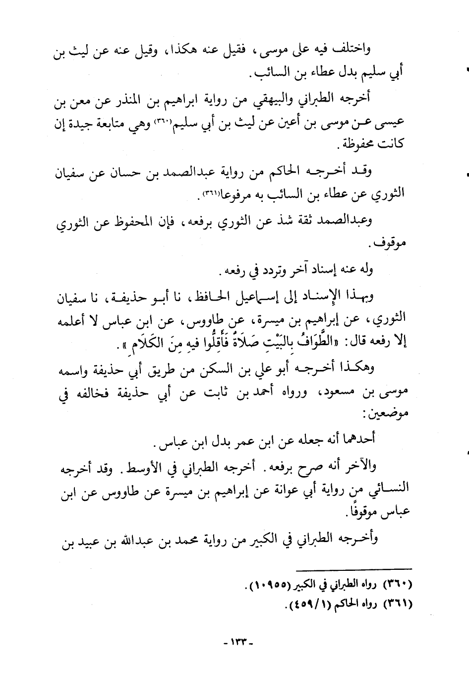 وبهذا الإسناد إلى إسماعيل الحافظ، نا أبو حذيفة، نا سفيان الثوري، عن إبراهيم بن ميسرة، عن طاووس، عن ابن عباس لا أعلمه إلا رفعه قال: "الطَّوَافُ بِالبَيْتِ صَلَاةٌ فَأَقِلُّوا فيهِ مِنَ الكَلَامِ".