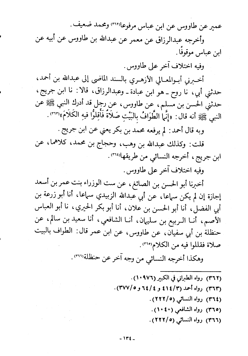 أخبرني أبو المعالي الأزهري بالسند الماضى إلى عبد اللَّه بن أحمد، حدثني أبي، نا روح -هو ابن عبادة- وعبد الرزاق، قالا: نا ابن جريج، حدثني الحسن بن مسلم، عن طاووس، عن رجل قد أدرك النبي -صلى اللَّه عليه وسلم- عن النبي -صلى اللَّه عليه وسلم- أنه قال: "إِنَّما الطَّوَافُ بِالبَيْتِ صَلَاةٌ فَأَقِلوُّا فيهِ الكَلَامَ" (¬363).
