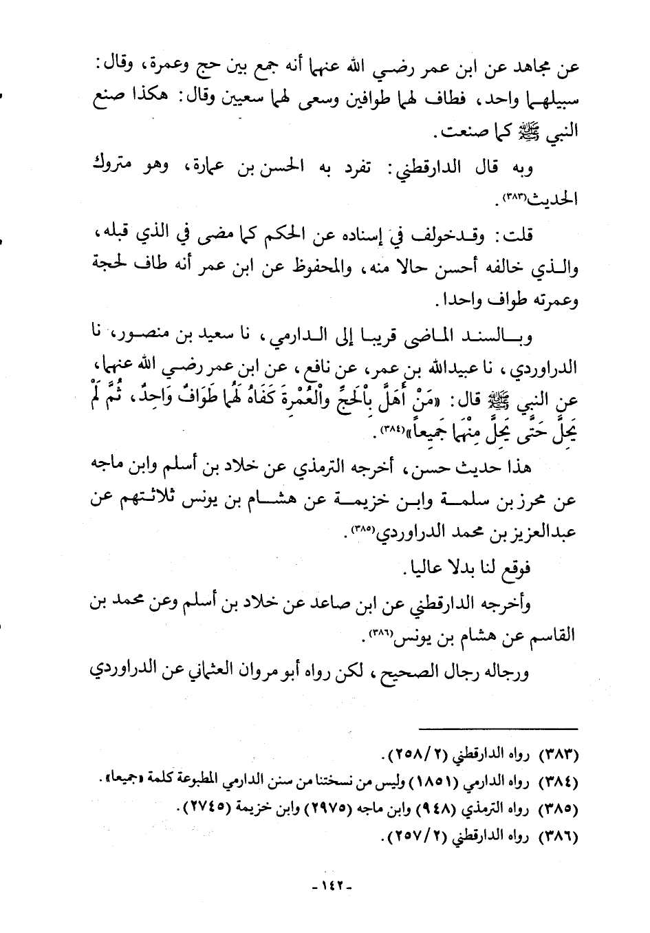 وبالسند الماضى قريبا إلى الدارمي، نا سعيد بن منصور، نا الدراوردي، نا عبيد اللَّه بني عمر، عن نافع، عن ابن عمر رضي اللَّه عنهما، عن النبي -صلى اللَّه عليه وسلم- قال: "مَنْ أَهَلَّ بِالحَجِّ والعُمْرِةَ كَفَاهُ لَهُما طَوَافٌ وَاحِدٌ، ثُمَّ لَمْ يَحِلَّ حَتَّى يَحِلَّ مِنْهَما جَميعًا" (¬384).