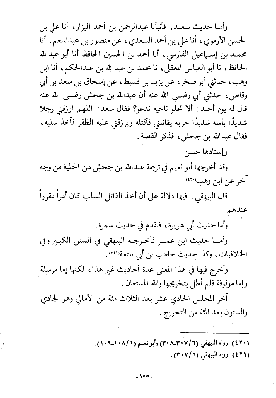 وأما حديث سعد، فأنبأنا عبد الرحمن بن أحمد البزار، أنا علي بن الحسن الأرموي، أنا علي بن أحمد السعدي، عن منصور بن عبد المنعم، أنا محمد بن إسماعيل الفارسي، أنا أحمد بن الحسين الحافظ أنا أبو عبد اللَّه الحافظ، نا أبو العباس المعقلي، نا محمد بن عبد اللَّه بن عبد الحكم، أنا ابن وهب، حدثني أبو صخر، عن يزيد بن قسيط، عن إسحاق بن سعد بن أبي وقاص، حدثني أبي رضي اللَّه عنه أن عبد اللَّه بن جحش رضي اللَّه عنه قال له يوم أحد: ألا تخلو ناحية تدعو؟ فقال سعد: اللهم ارزقني رجلا شديدًا بأسه شديدًا حربه يقاتلني فأقتله ويرزقني عليه الظفر فآخذ سلبه، فقال عبد اللَّه بن جحش، فذكر القصة.