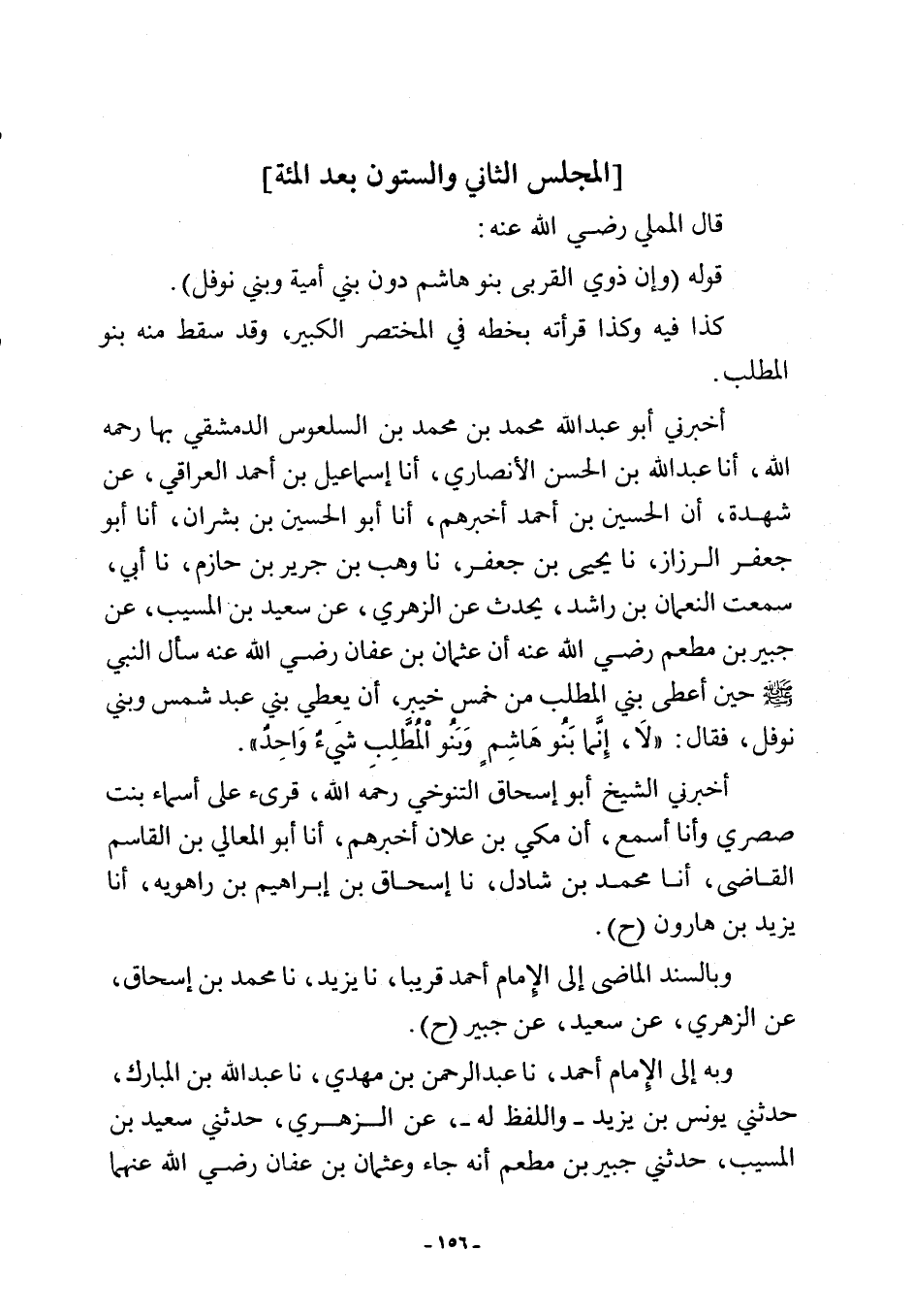 أخبرني أبو عبد اللَّه محمد بن محمد بن السلعوس الدمشقي بها رحمه اللَّه، أنا عبد اللَّه بن الحسن الأنصاري، أنا إسماعيل بن أحمد العراقي، عن شهدة، أن الحسين بن أحمد أخبرهم، أنا أبو الحسين بن بشران، أنا أبو جعفر الرزاز، نا يحيى بن جعفر، نا وهب بن جرير بن حازم، نا أبي، سمعت النعمان بن راشد، يحدث عن الزهري، عن سعيد بن المسيب، عن جبير بن مطعم رضي اللَّه عنه أن عثمان بن عفان رضي اللَّه عنه سأل النبي -صلى اللَّه عليه وسلم- حين أعطى بني المطلب من خمس خيبر، أن يعطي بني عبد شمس وبني نوفل، فقال: "لَا، إِنَّما بَنُو هَاشِمٍ وَبَنُو المُطَّلِب شَيءٌ وَاحِدٌ".