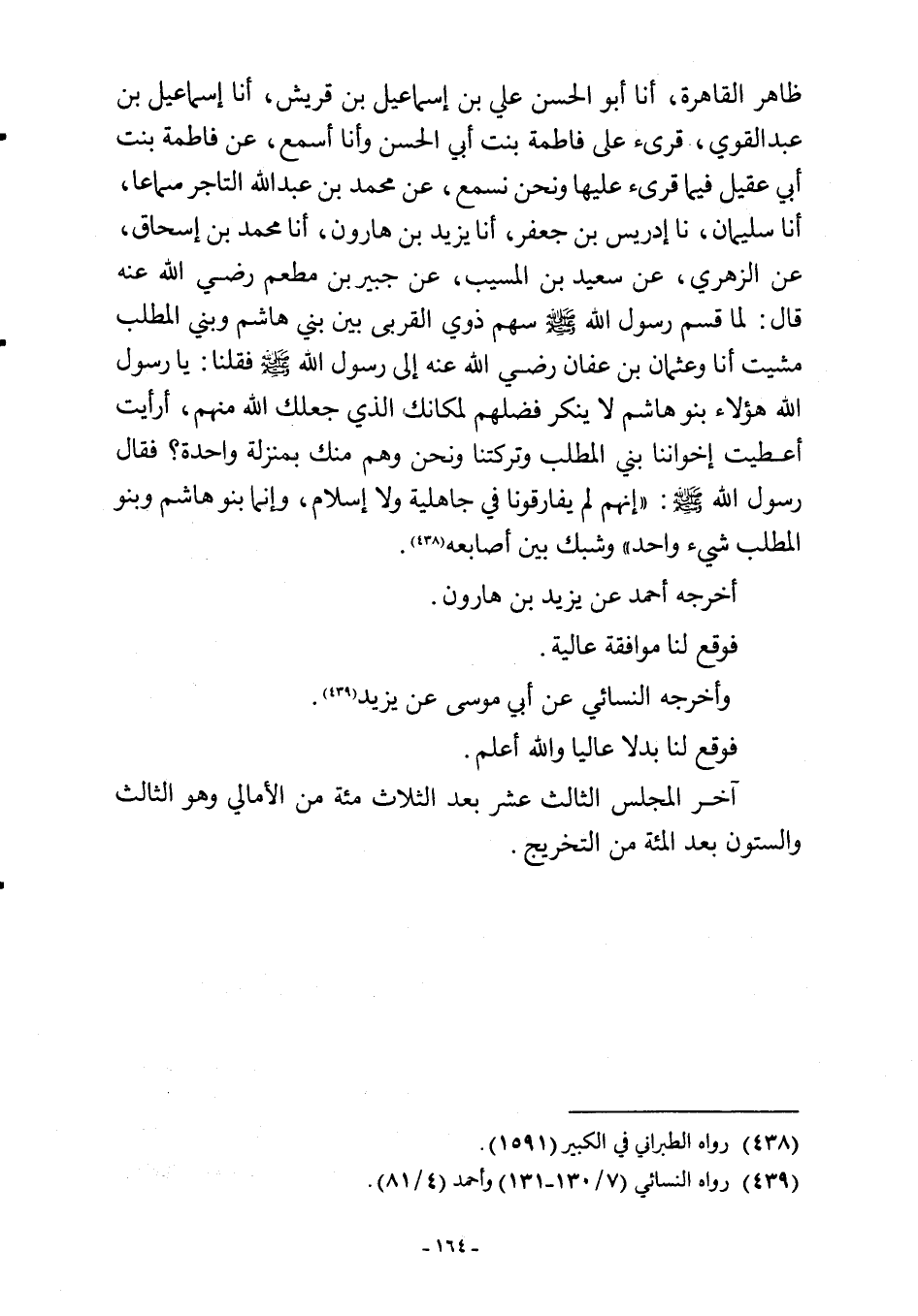 ظاهر القاهرة، أنا أبو الحسن علي بن إسماعيل بن قريش، أنا إسماعيل بن عبد القوي، قرئ على فاطمة بنت أبي الحسن وأنا أسمع، عن فاطمة بنت أبي عقيل فيما قرئ عليها ونحن فسح، عن محمد بن عبد اللَّه التاجر سماعا، أنا سليمان، نا إدريس بن جعفر، أنا يزيد بن هارون، أنا محمد بن إسحاق، عن الزهري، عن سعيد بن المسيب، عن جبير بن مطعم رضي اللَّه عنه قال: لما قسم رسول اللَّه -صلى اللَّه عليه وسلم- سهم ذوي القربى بين بني هاشم وبني المطلب مشيت أنا وعثمان بن عفان رضي اللَّه عنه إلى رسول اللَّه -صلى اللَّه عليه وسلم- فقلنا: يا رسول اللَّه هؤلاء بنو هاشم لا ينكر فضلهم لمكانك الذي جعلك اللَّه منهم، أرأيت أعطيت إخواننا بني المطلب وتركتنا ونحن وهم منك بمنزلة واحدة؟ فقال رسول اللَّه -صلى اللَّه عليه وسلم-: "إنهم لم يفارقونا في جاهلية ولا إسلام، وإنما بنو هاشم وبنو المطلب شيء واحد" وشبك بين أصابعه (¬438).
