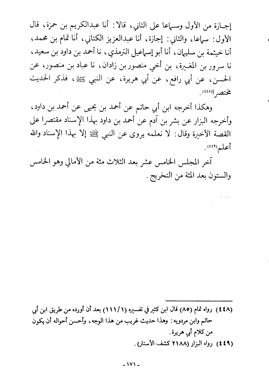 (¬448) رواه تمام (85) قال ابن كثير في تفسيره (1/ 111) بعد أن أورده من طريق ابن أبي حاتم وابن مردويه: وهذا حديث غريب من هذا الوجه، وأحسن أحواله أن يكون من كلام أبي هريرة.