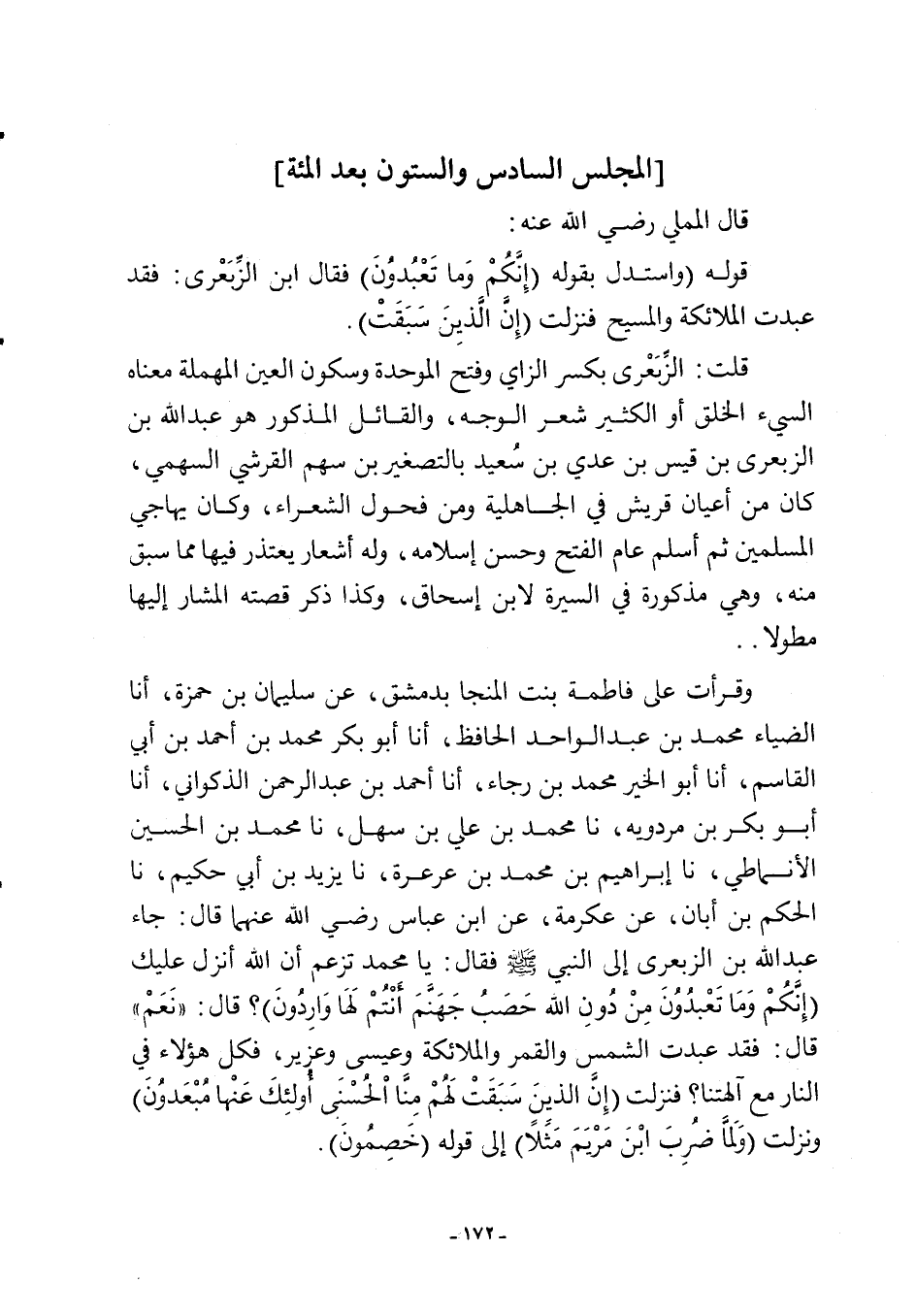 وقرأت على فاطمة بنت المنجا بدمشق، عن سليمان بن حمزة، أنا الضياء محمد بن عبد الواحد الحافظ، أنا أبو بكر محمد بن أحمد بن أبي القاسم، أنا أبو الخير محمد بن رجاء، أنا أحمد بن عبد الرحمن الذكواني، أنا أبو بكر بن مردويه، نا محمد بن علي بن سهل، نا محمد بن الحسين الأنماطي، نا إبراهيم بن محمد بن عرعرة، نا يزيد بن أبي حكيم، نا الحكم بن أبان، عن عكرمة، عن ابن عباس رضي اللَّه عنهما قال: جاء عبد اللَّه بن الزبعرى إلى النبي -صلى اللَّه عليه وسلم- فقال: يا محمد تزعم أن اللَّه أنزل عليك {إِنَّكُمْ وَمَا تَعْبُدُونَ مِنْ دُونِ اللَّهِ حَصَبُ جَهَنَّمَ أَنْتُمْ لَهَا وَارِدُونَ}؟ قال: "نَعَمْ" قال: فقد عبدت الشمسِ والقمر والملائكة وعيسى وعزير، فكل هؤلاء في النار مع آلهتنا؟ فنزلت {إِنَّ الَّذِينَ سَبَقَتْ لَهُمْ مِنَّا الْحُسْنَى أُولَئِكَ عَنْهَا مُبْعَدُونَ} ونزلت {وَلَمَّا ضُرِبَ ابْنُ مَرْيَمَ مَثَلًا} إلى قوله {خَصِمُونَ}.