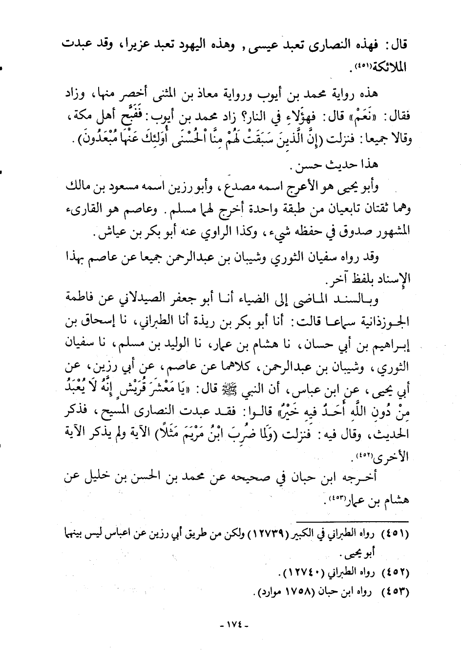 هذه رواية محمد بن أيوب ورواية معاذ بن المثني أخصر منها، وزاد فقال: "نَعَمْ" قال: فهؤلاءِ في النار؟ زاد محمد بن أيوب: فَفَبَّح أهل مكة، وقالا جميعا: فنزلت {إِنَّ الَّذِينَ سَبَقَتْ لَهُمْ مِنَّا الْحُسْنَى أُولَئِكَ عَنْهَا مُبْعَدُونَ}.