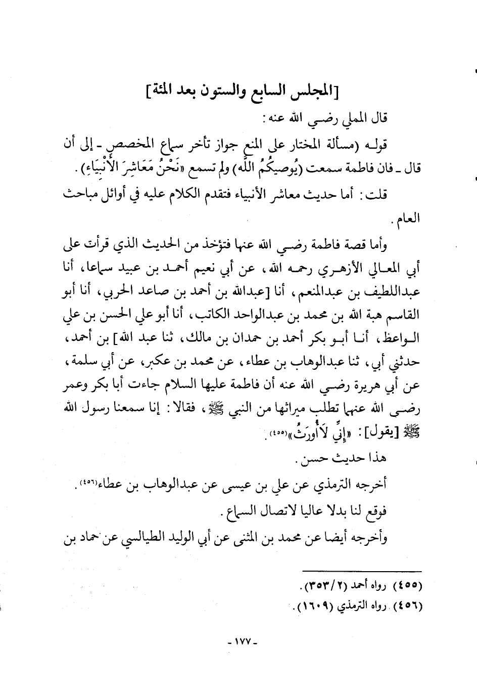 وأما قصة فاطمة رضي اللَّه عنها فتؤخذ من الحديث الذي قرأت على أبي المعالي الأزهري رحمه اللَّه، عن أبي نعيم أحمد بن عبيد سماعا، أنا عبد اللطيف بن عبد المنعم، أنا [عبد اللَّه بن أحمد بن صاعد الحربي، أنا أبو القاسم هبة اللَّه بن محمد بن عبد الواحد الكاتب، أنا أبو علي الحسن بن علي الواعظ، أنا أبو بكر أحمد بن حمدان بن مالك، ثنا عبد اللَّه] بن أحمد، حدثني أبي، ثنا عبد الوهاب بن عطاء، عن محمد بن عكبر، عن أبي سلمة، عن أبي هريرة رضي اللَّه عنه أن فاطمة عليها السلام جاءت أبا بكر وعمر رضي اللَّه عنهما تطلب ميراثها من النبي -صلى اللَّه عليه وسلم-، فقالا: إنا سمعنا رسول اللَّه -صلى اللَّه عليه وسلم-[يقول]: "إِنِّي لَا أُورَثُ" (¬455).