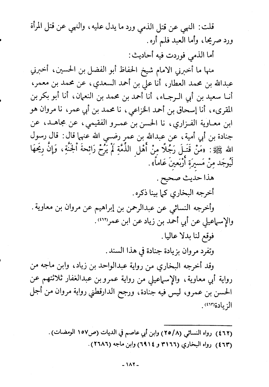 منها ما أخبرني الامام شيخ الحفاظ أبو الفضل بن الحسين، أخبرني عبد اللَّه بن محمد العطار، أنا علي بن أحمد السعدي، عن محمد بن معمر، أنا سعيد بن أبي الرجاء، أنا أحمد بن محمد بن النعمان، أنا أبو بكر بن المقرئ، أنا إسحاق بن أحمد الخزاعي، نا محمد بن أبي عمر، نا مروان هو ابن معاوية الفزاري، نا الحسن بن عمرو الفقيمي، عن مجاهد، عن جنادة بن أبي أمية، عن عبد اللَّه بن عمر رضي اللَّه عنهما قال: قال رسول اللَّه -صلى اللَّه عليه وسلم-: "مَنْ قَتَلَ رَجُلًا مِنْ أَهْلِ الذِّمَّةِ لَمْ يَرُحْ رَائِحةَ الْجَنَّةِ، وَإِنَّ رِيحَهَا لَيُوجَد مِنْ مَسِيرَةِ أَربَعينَ عَامًا".