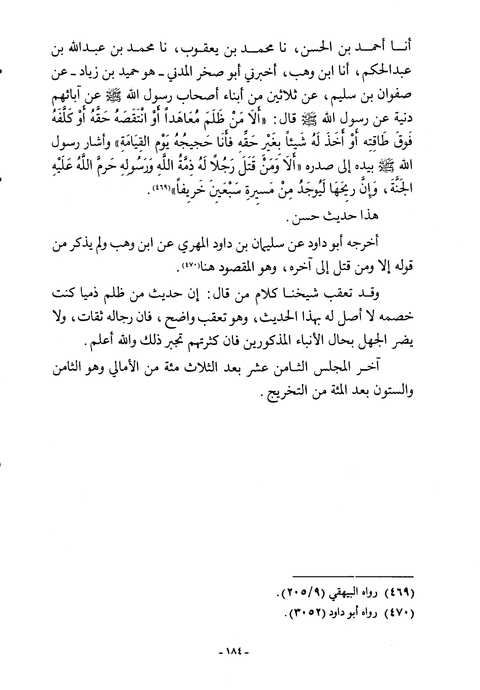 أنا أحمد بن الحسن، نا محمد بن يعقوب، نا محمد بن عبد اللَّه بن عبد الحكم، أنا ابن وهب، أخبرني أبو صخر المدني -هو حميد بن زياد- عن صفوان بن سليم، عن ثلاثين من أبناء أصحاب رسول اللَّه -صلى اللَّه عليه وسلم- في آبائهم دنية عن رسول اللَّه -صلى اللَّه عليه وسلم- قال: "أَلَا مَنْ ظَلَمَ مُعَاهَدًا أَوْ انْتَقصَهُ حَقَّهُ أوْ كَلَّفَهُ فَوقَ طَاقِتِه أَوْ أَخَذَ لَهُ شَيئًا بِغَير حَقِّهِ فأَنَا حَجيجُهُ يَوْم القيَامَةِ" وأشار رسول اللَّه -صلى اللَّه عليه وسلم- بيده إلا صدره "ألَا وَمَنْ قَتَلَ رَجُلًا لَهُ ذِمَّةُ اللَّه وَرَسُولهِ حَرَّم اللَّهُ عَلَيْهِ الجَنَّةَ، وَإِنَّ رِيحَهَا لَيُوجَدُ مِنْ مَسيرةِ سَبْعَينَ خَريفًا" (¬469).
