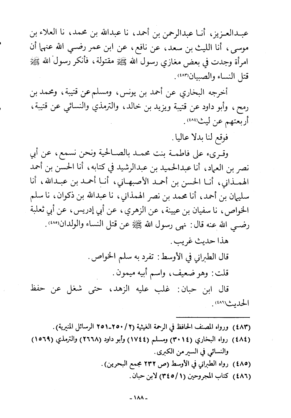 عبد العزيز، أنا عبد الرحمن بن أحمد، نا عبد اللَّه بن محمد، نا العلاء بن موسى، أنا الليث بن سعد، عن نافع، عن ابن عمر رضي اللَّه عنهما أن امرأة وجدت في بعض مغازي رسول اللَّه -صلى اللَّه عليه وسلم- مقتولة، فأنكر رسول اللَّه -صلى اللَّه عليه وسلم- قتل النساء والصبيان (¬483).