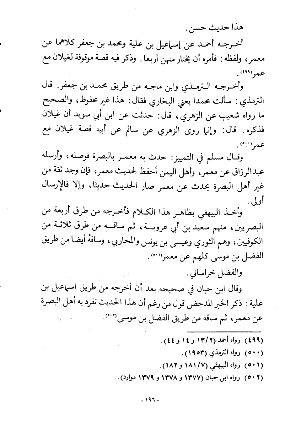 وأخرجه الترمذي وابن ماجه من طريق محمد بن جعفر. قال الترمذي: سألت محمدًا يعني البخاري فاتال: هذا غير محفوظ، والصحيح ما رواه شعيب عن الزهري، قال: حدثت عن ابن أبي سويد أن غيلان فذكره. قال: وإنما روى الزهري عن سالم عن أبيه قصة غيلان مع عمر (¬500).