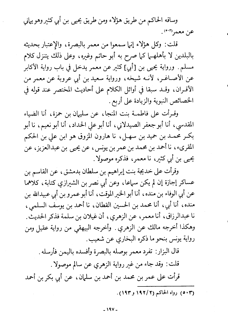 قلت: وكل هؤلاء إنما سمعوا من معمر بالبصرة، والإعتبار بحديثه بالبلدين لا بأهلهما كما صرح به أبو حاتم وغيره، وعلى ذلك يتنزل كلام مسلم. ورواية يحيى بن [أبي] كثير عن معمر يدخل في باب رواية الأكابر عن الأصاغر، لأنه شيخه، ورواية سعيد بن أبي عروبة عن معمر من الأقران، وقد سبقا في أوائل الكلام على أحاديث المختصر عند قوله في الخصائص النبوية والزيادة على أربع.