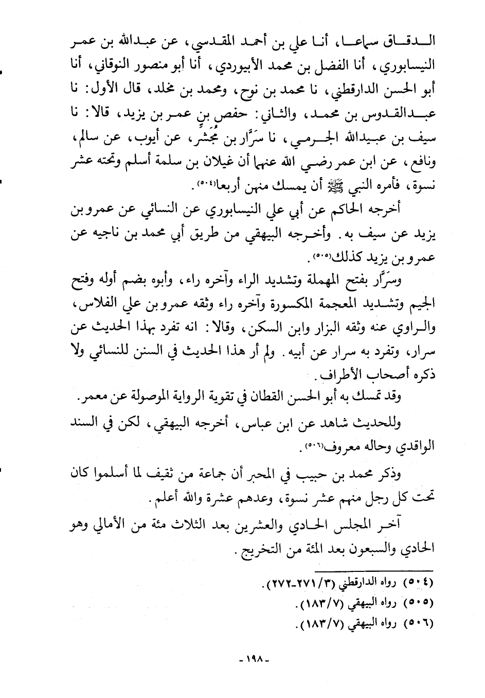الدقاق سماعا، أنا علي بن أحمد المقدسي، عن عبد اللَّه بن عمر النيسابوري، أنا الفضل بن محمد الأبيوردي، أنا أبو منصور النوقاني، أنا أبو الحسن الدارقطني، نا محمد بن نوح، ومحمد بن مخلد، قال الأول: نا عبد القدوس بن محمد، والثاني: حفص بن عمر بن يزيد، قالا: نا سيف بن عبيد اللَّه الجرمي، نا سَرَّار بن مُجَشّر، عن أيوب، عن سالم، ونافع، عن ابن عمر رضي اللَّه عنهما أن غيلان بن سلمة أسلم وتحته عشر نسوة، فأمره النبي -صلى اللَّه عليه وسلم- أن يمسك منهن أربعًا (¬504).