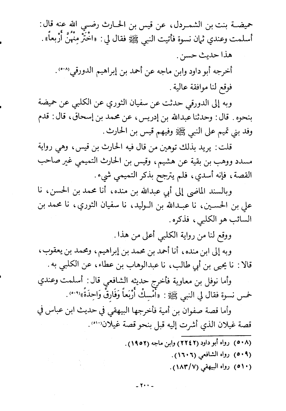 حميضة بنت بن الشمردل، عن قيس بن الحارث رضي اللَّه عنه قال: أسلمت وعندي ثمان نسوة فأتيت النبي -صلى اللَّه عليه وسلم- فقال في: "اخْتَرْ مِنْهُنَّ أَرْبعًا".