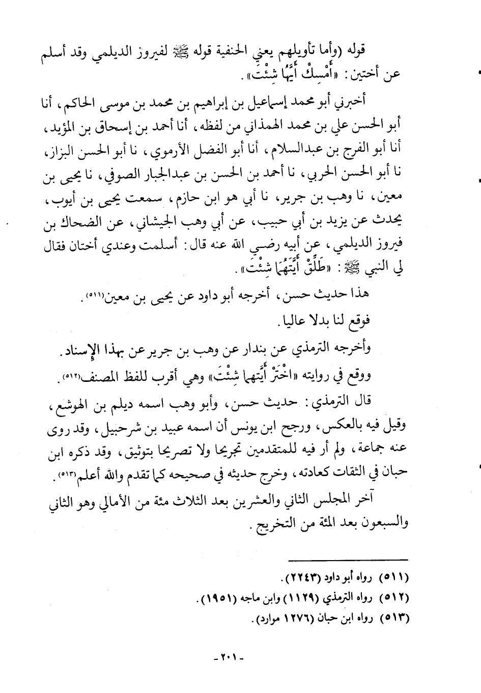 أخبرني أبو محمد إسماعيل بن إبراهيم بن محمد بن موسى الحاكم، أنا أبو الحسن علي بن محمد الهمذاني من لفظه، أنا أحمد بن إسحاق بن المؤيد، أنا أبو الفرج بن عبد السلام، أنا أبو الفضل الأرموي، نا أبو الحسن البزاز، نا أبو الحسن الحربي، نا أحمد بن الحسن بن عبد الجبار الصوفي، نا يحيى بن معين، نا وهب بن جرير، نا أبي هو ابن حازم، سمعت يحيى بن أيوب، يحدث عن يزيد بن أبي حبيب، عن أبي وهب الجيشاني، عن الضحاك بن فيروز الديلمي، عن أبيه رضي اللَّه عنه قال: أسلمت وعندي أختان فقال لي النبي -صلى اللَّه عليه وسلم-: "طَلِّق أَيَّتَهُمَا شِئْتَ".
