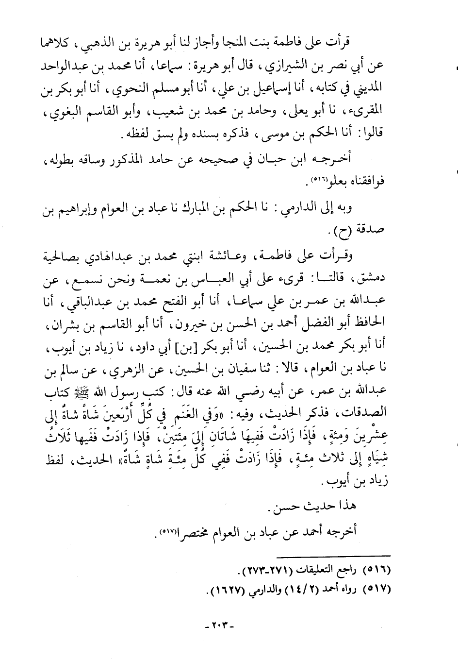 وقرأت على فاطمة، وعائشة ابنتي محمد بن عبد الهادي بصالحية دمشق، قالتا: قرئ على أبي العباس بن نعمة ونحن نسمع، عن عبد اللَّه بن عمر بن علي سماعا، أنا أبو الفتح محمد بن عبد الباقي، أنا الحافظ أبو الفضل أحمد بن الحسن بن خيرون، أنا أبو القاسم بن بشران، أنا أبو بكر محمد بن الحسين، أنا أبو بكر [بن] أبي داود، نا زياد بن أيوب، نا عباد بن العوام، قالا: ثنا سفيان بن الحسين، عن الزهري، عن سالم بن عبد اللَّه بن عمر، عن أبيه رضي اللَّه عنه قال: كتب رسول اللَّه -صلى اللَّه عليه وسلم- كتاب الصدقات، فذكر الحديث، وفيه: "وَفِي الغَنَمِ فِي كُلِّ أَرْبَعينَ شَاةً شاةٌ إِلى عِشْرينَ وَمِئةٍ، فَإِذَا زَادَتْ فَفِيها شَاتَانِ إِلَى مِئَتَينْ، فَإِذَا زَادَتْ فَفيها ثَلَاثُ شِيَاهٍ إِلى ثلاث مِئةٍ، فَإِذَا زَادَتْ فَفِي كُلِّ مِئَةِ شَاةٍ شَاةٌ" الحديث، لفظ زياد بن أيوب.