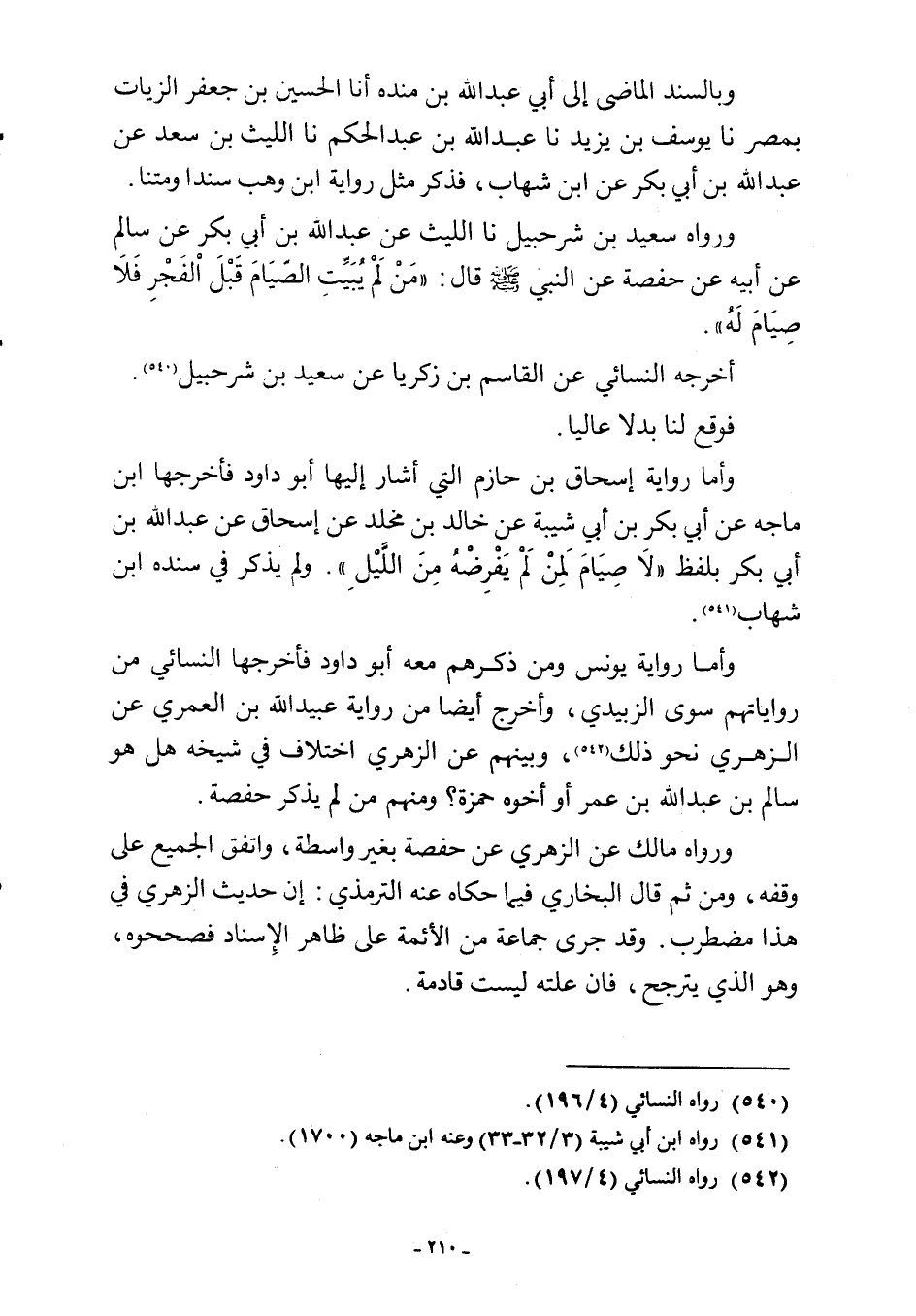 ورواه مالك عن الزهري عن حفصة بغير واسطة، واتفق الجميع على وقفه، ومن ثم قال البخاري فيما حكاه عنه الترمذي: إن حديث الزهري في هذا مضطرب. وقد جرى جماعة من الأئمة على ظاهر الإسناد فصححوه، وهو الذي يترجح، فإن علته ليست قادمة.