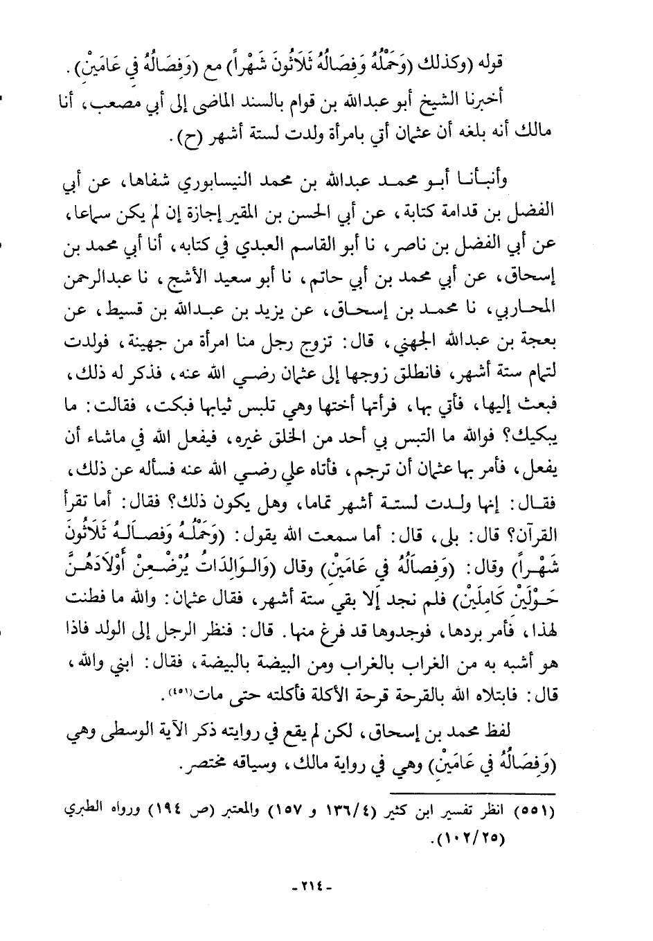 وأنبأنا أبو محمد عبد اللَّه بن محمد النيسابوري شفاها، عن أبي الفضل بن قدامة كتابة، عن أبي الحسن بن المقير إجازة إن لم يكن سماعا، عن أبي الفضل بن ناصر، نا أبو القاسم العبدي في كتابه، أنا أبي محمد بن إسحاق، عن أبي محمد بن أبي حاتم، نا أبو سعيد الأشج، نا عبد الرحمن المحاربي، نا محمد بن إسحاق، عن يزيد بن عبد اللَّه بن قسيط، عن بعجة بن عبد اللَّه الجهني، قال: تزوج رجل منا امرأة من جهينة، فولدت لتمام ستة أشهر، فانطلق زوجها إلى عثمان رضي اللَّه عنه، فذكر له ذلك، فبعث إليها، فأتي بها، فرأتها أختها وهي تلبس ثيابها فبكت، فقالت: ما يبكيك؟ فواللَّه ما التبس بي أحد من الخلق غيره، فيفعل اللَّه في ما شاء أن يفعل، فأمر بها عثمان أن ترجم، فأتاه علي رضي اللَّه عنه فسأله عن ذلك، فقال: إنها ولدت لستة أشهر تمامًا، وهل يكون ذلك؟ فقال: أما تقرأ القرآن؟ قال: بلى، قال: أما سمعت اللَّه يقول: (وَحَمْلُهُ وَفصالَهُ ثَلَاثُونَ شَهْرًا) وقال: (وَفِصَالُهُ في عَامَيْنِ) وقال (وَالوَالِدَاتُ يُرْضْعِنْ أَوْلَادَهُنَّ حَوْلَيْن كَامِلَين) فلم نجد إلا بقي ستة أشهر، فقال عثمان: واللَّه ما فطنت لهذا، فَأمر بردها، فوجدوها قد فرغ منها. قال: فنظر الرجل إلى الولد فإذا هو أشبه به من الغراب بالغراب ومن البيضة بالبيضة، فقال: ابني واللَّه، قال: فابتلاه اللَّه بالقرحة قرحة الأكلة فأكلته حتى مات (¬551).