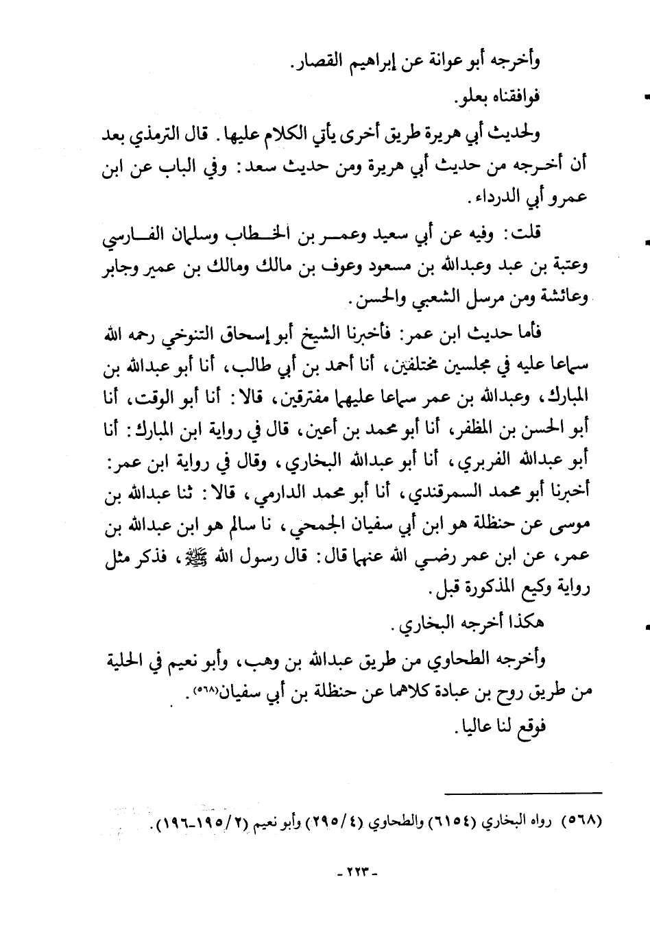 فأما حديث ابن عمر: فأخبرنا الشيخ أبو إسحاق التنوخي رحمه اللَّه سماعا عليه في مجلسين مختلفين، أنا أحمد بن أبي طالب، أنا أبو عبد اللَّه بن المبارك، وعبد اللَّه بن عمر سماعا عليهما مفترقين، قالا: أنا أبو الوقت، أنا أبو الحسن بن المظفر، أنا أبو محمد بن أعين، قال في رواية ابن المبارك: أنا أبو عبد اللَّه الفربري، أنا أبو عبد اللَّه البخاري، وقال في رواية ابن عمر: أخبرنا أبو محمد السمرقندي، أنا أبو محمد الدارمي، قالا: ثنا عبد اللَّه بن موسى عن حنظلة هو ابن أبي سفيان الجمحي، نا سالم هو ابن عبد اللَّه بن عمر، عن ابن عمر رضي اللَّه عنهما قال: قال رسول اللَّه -صلى اللَّه عليه وسلم-، فذكر مثل رواية وكيع المذكورة قبل.