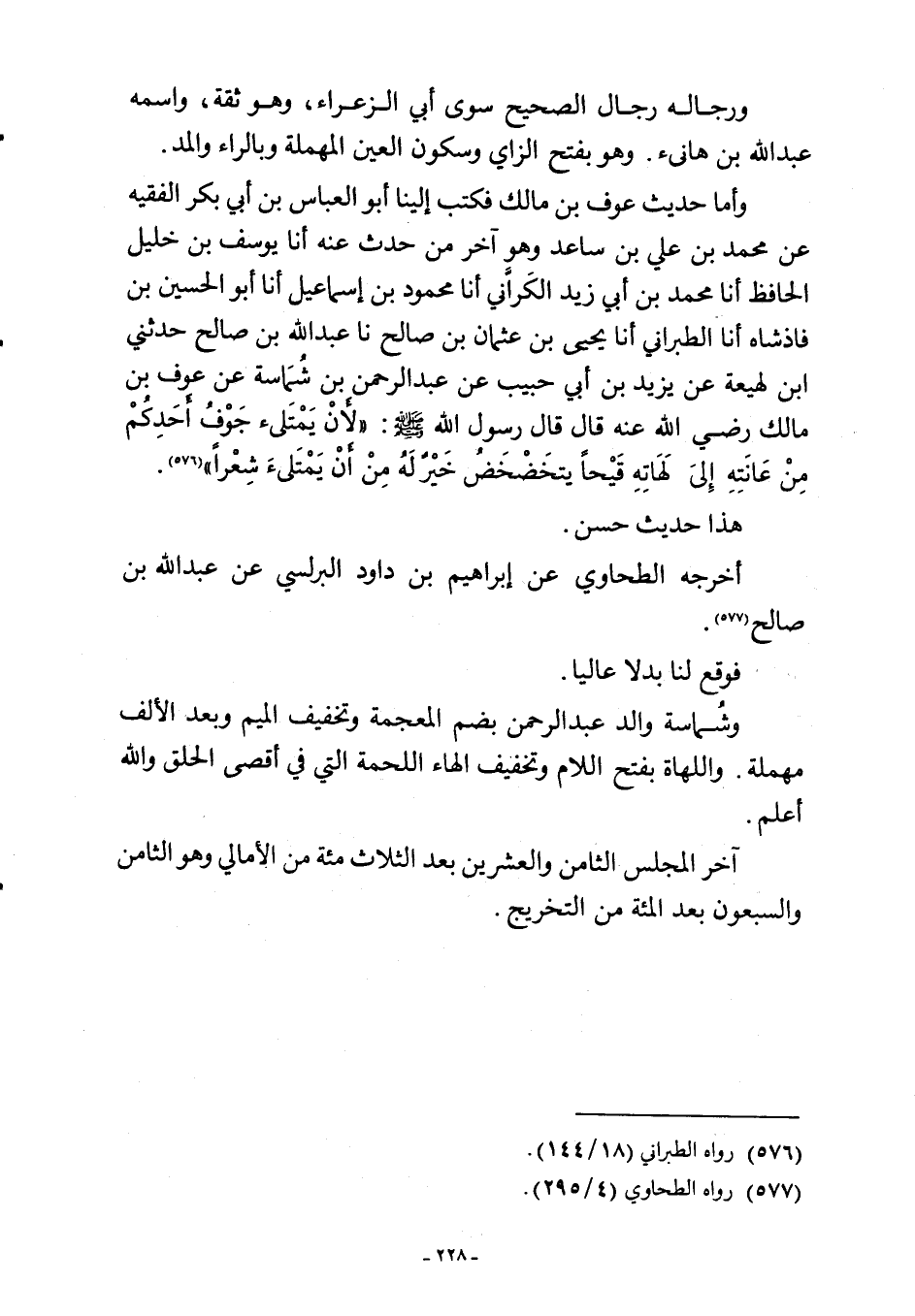 وأما حديث عوف بن مالك فكتب إلينا أبو العباس بن أبي بكر الفقيه عن محمد بن علي بن ساعد وهو آخر من حدث عنه أنا يوسف بن خليل الحافظ أنا محمد بن أبي زيد الكَرَّاني أنا محمود بن إسماعيل أنا أبو الحسين بن فاذشاه أنا الطبراني أنا يحيى بن عثمان بن صالح نا عبد اللَّه بن صالح حدثني ابن لهيعة عن يزيد بن أبي حبيب عن عبد الرحمن بن شُمَاسة عن عوف بن مالك رضي اللَّه عنه قال قال رسول اللَّه -صلى اللَّه عليه وسلم-: "لأَنْ يَمْتَلئ جَوْفُ أَحَدِكُمْ مِنْ عَانَتِهِ إِلَى لَهَاتِهِ قَيْحًا يتخَضْخَضُ خَيْرٌ لَهُ مِنْ أَنْ يَمْتَلئَ شِعْرًا" (¬576).