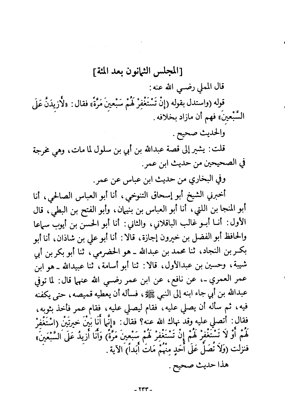 أخبرني الشيخ أبو إسحاق التنوخي، أنا أبو العباس الصالحي، أنا أبو المنجا بن اللتي، أنا أبو العباس بن بنيمان، وأبو الفتح بن البطي، قال الأول: أنا أبو غالب الباقلاني، والثاني: أنا أبو الحسن بن أيوب سماعا والحافظ أبو الفضل بن خيرون إجازة، قالا: أنا أبو علي بن شاذان، أنا أبو بكر بن النجاد، ثنا محمد بن عبد اللَّه -هو الحضرمي، ثنا أبو بكر بن أبي شيبة، وحسين بن عبد الأول، قالا: ثنا أبو أسامة، ثنا عبيد اللَّه -هو ابن عمر العمري-، عن نافع، عن ابن عمر رضي اللَّه عنهما قال: لما توفي عبد اللَّه بن أبي جاء ابنه إلى النبي -صلى اللَّه عليه وسلم-، فسأله أن يعطيه قميصه، حتى يكفنه فيه، ثم سأله أن يصلي عليه، فقام ليصلي عليه، فقام عمر فأخذ بثوبه، فقال: أتصلي عليه وقد نهاك اللَّه عنه؟ فقال: "إِنَّما أَنَا بَيْنَ خيرتَيْنِ {اسْتَغْفِرْ لَهُمْ أَوْ لَا تَسْتَغْفِرْ لَهُمْ إِنْ تَسْتَغْفِرْ لَهُمْ سَبْعِينَ مَرَّةً} وَأَنَّا أَزِيدُ عَلَى السَّبْعَينَ" فنزلت {وَلَا تُصَلِّ عَلَى أَحَدٍ مِنْهُمْ مَاتَ أَبَدًا} الآية.