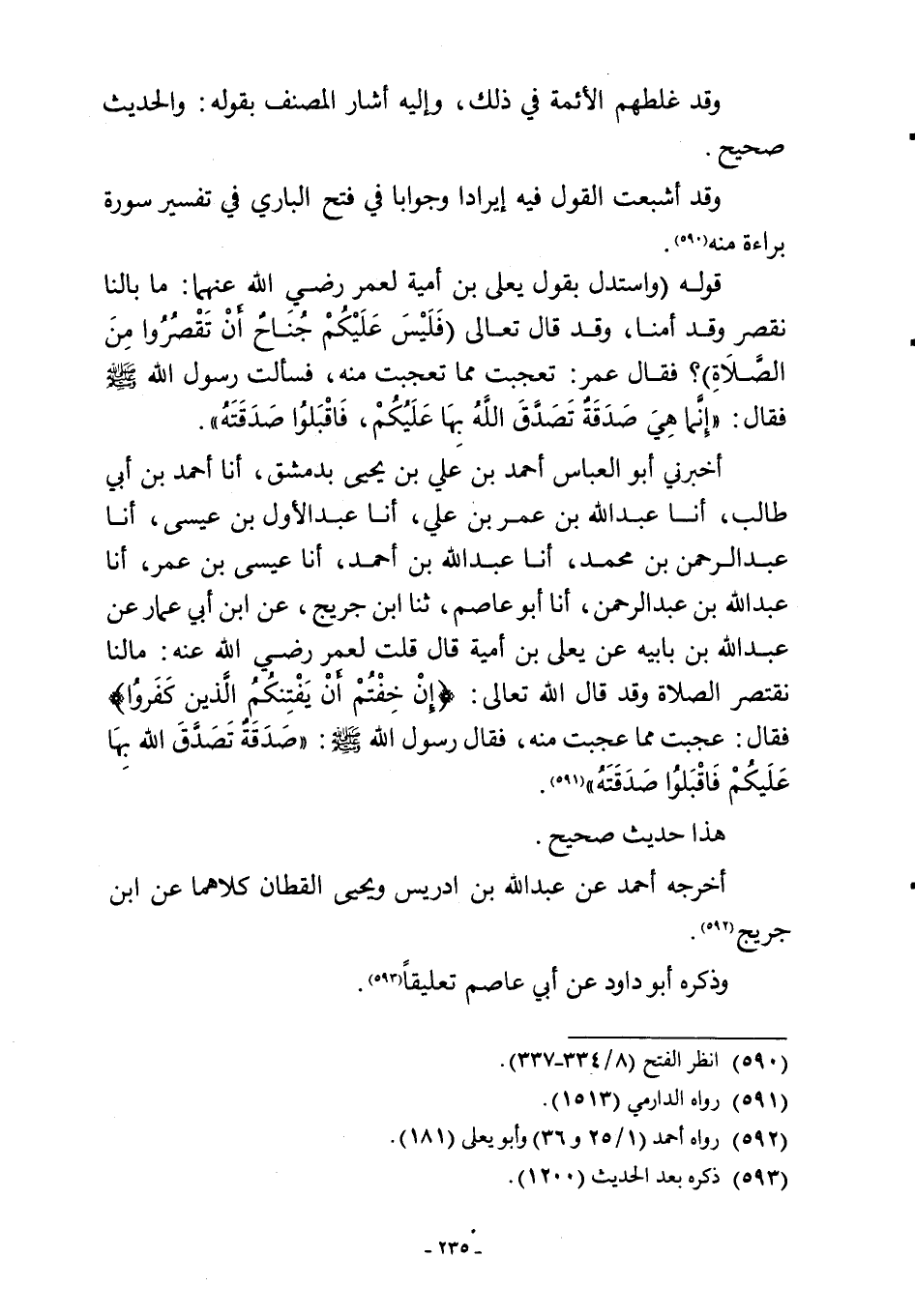 أخبرني أبو العباس أحمد بن علي بن يحيى بدمشق، أنا أحمد بن أبي طالب، أنا عبد اللَّه بن عمر بن علي، أنا عبد الأول بن عيسى، أنا عبد الرحمن بن محمد، أنا عبد اللَّه بن أحمد، أنا عيسى بن عمر، أنا عبد اللَّه بن عبد الرحمن، أنا أبو عاصم، ثنا ابن جريج، عن ابن أبي عمار عن عبد اللَّه بن بابيه عن يعلى بن أمية قال قلت لعمر رضي اللَّه عنه: ما لنا نقتصر الصلاة وقد قال اللَّه تعالى: {إِنْ خِفْتُمْ أَنْ يَفْتِنَكُمُ الَّذِينَ كَفَرُوا} فقال: عجبت مما عجبت منه، فقال رسول اللَّه -صلى اللَّه عليه وسلم-: "صَدَقةٌ تَصَدَّقَ اللَّه بِهَا عَلَيكُمْ فَاقْبَلوُا صَدَقَتَهُ" (¬591).