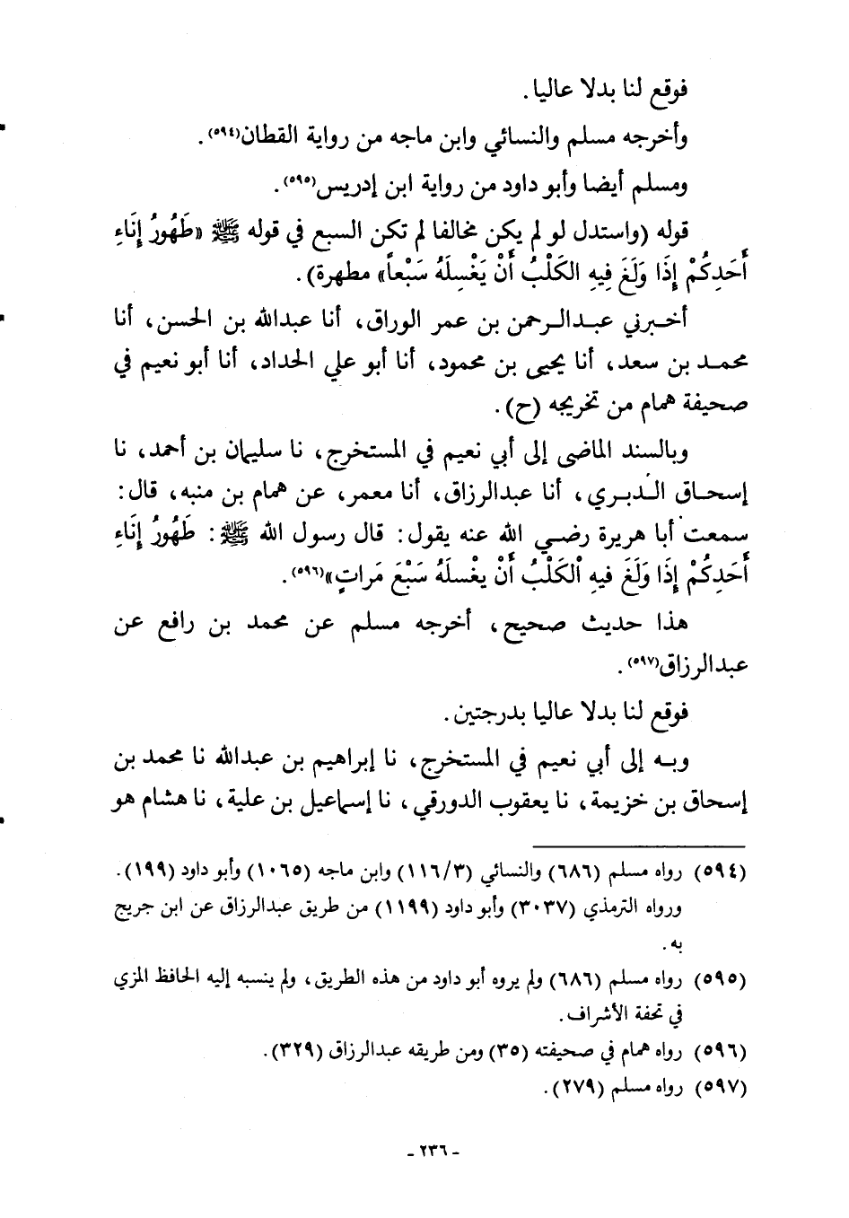 وبالسند الماضى إلى أبي نعيم في المستخرج، نا سليمان بن أحمد، نا إسحالق الدبري، أنا عبد الرزاق، أنا معمر، عن همام بن منبه، قال: سمعت أبا هريرة رضي اللَّه عنه يقول: قال رسول اللَّه -صلى اللَّه عليه وسلم-: طَهُورُ إِنَاءِ أَحَدِكُمْ إذَا وَلَغَ فيهِ الْكَلْبُ أَنْ يغْسلَهُ سَبْعَ مَراتٍ" (¬596).