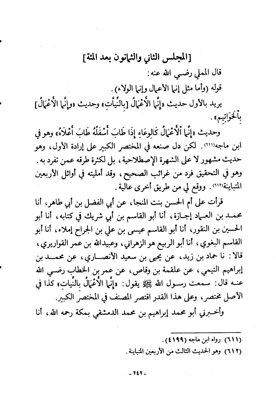 قرأت على أم الحسن بنت المنجا، عن أبي الفضل بن أبي طاهر، أنا محمد بن العماد إجازة، أنا أبو القاسم بن أبي شريك في كتابه، أنا أبو الحسين بن النقور، أنا أبو القاسم عيسى بن علي بن الجراح إملاء، أنا أبو القاسم البغوي، أنا أبو الربيع هو الزهراني، وعبيد اللَّه بن عمر القواريري، قالا: نا حماد بن زيد، عن يحيى بن سعيد الأنصاري، عن محمد بن إبراهيم التيمي، عن علقمة بن وقاص، عن عمر بن الخطاب رضي اللَّه عنه قال: سمعت رسول اللَّه -صلى اللَّه عليه وسلم- يقول: "إِنَّما الأَعْمَالُ باِلنِّياتِ" كذا في الأصل مختصر، وعلى هذا القدر اقتصر المصنف في المختصر الكبير.