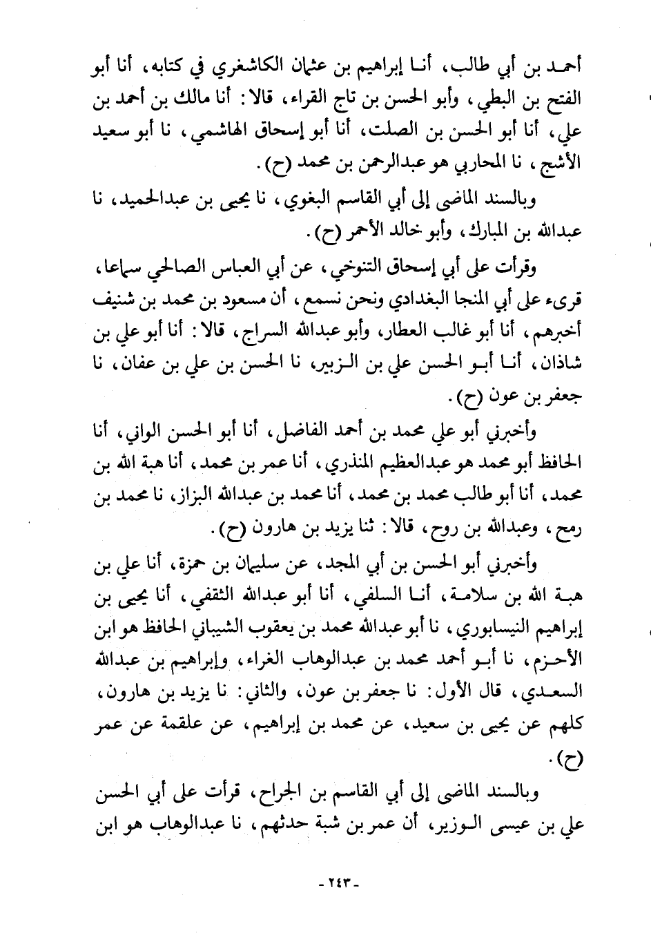 وقرأت على أبي إسحاق التنوخي، عن أبي العباس الصالحي سماعا، قرئ على أبي المنجا البغدادي ونحن نسمع، أن مسعود بن محمد بن شنيف أخبرهم، أنا أبو غالب العطار، وأبو عبد اللَّه السراج، قالا: أنا أبو علي بن شاذان، أنا أبو الحسن علي بن الزبير، نا الحسن بن علي بن عفان، نا جعفر بن عون (ح).