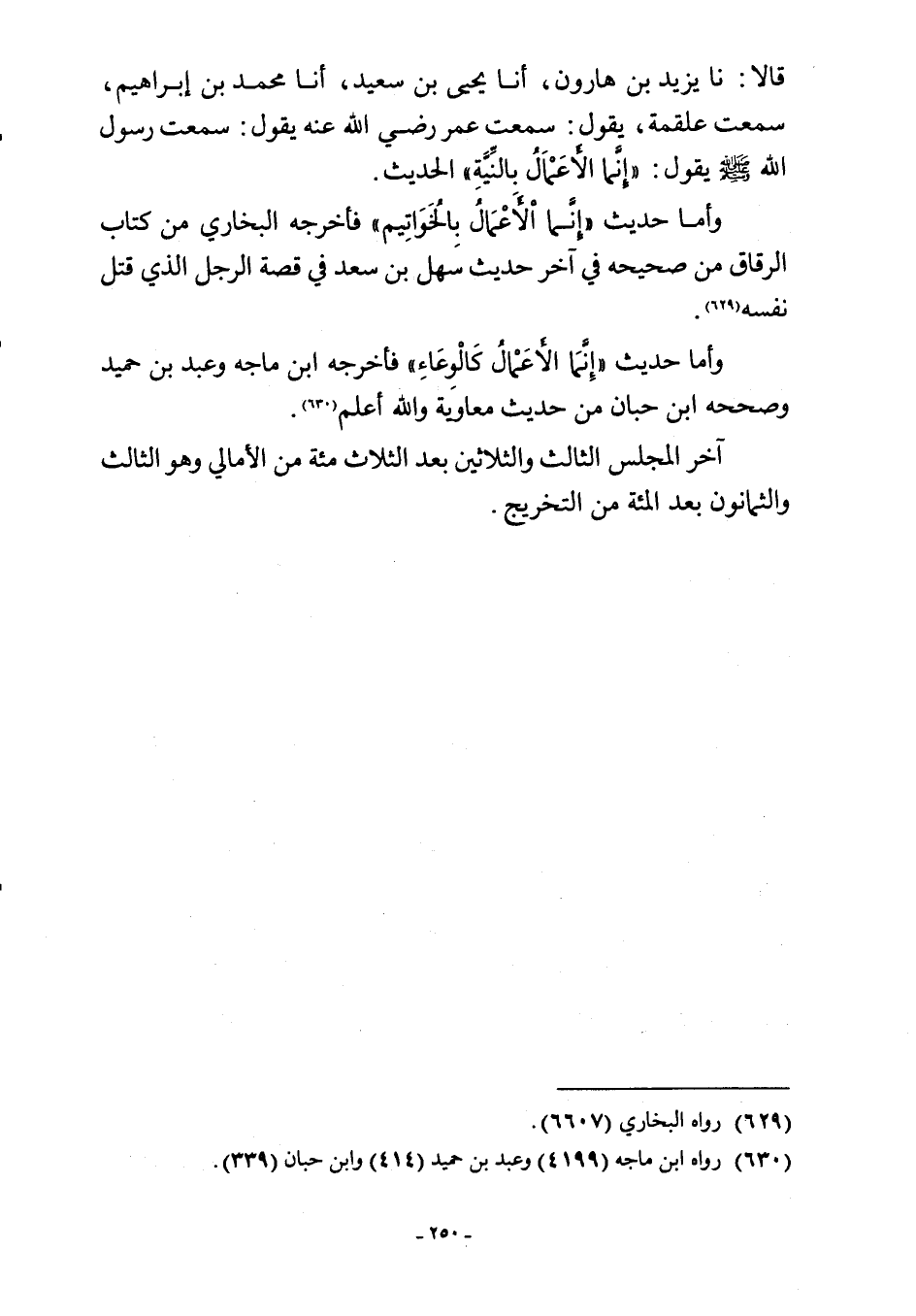 قالا: نا يزيد بن هارون، أنا يحيى بن سعيد، أنا محمد بن إِبراهيم، سمعت علقمة، يقول: سمعت عمر رضي اللَّه عنه يقول: سمعت رسول اللَّه -صلى اللَّه عليه وسلم- يقول: "إِنَّمَا الأَعَمْالُ بالنِّيَّةِ" الحديث.