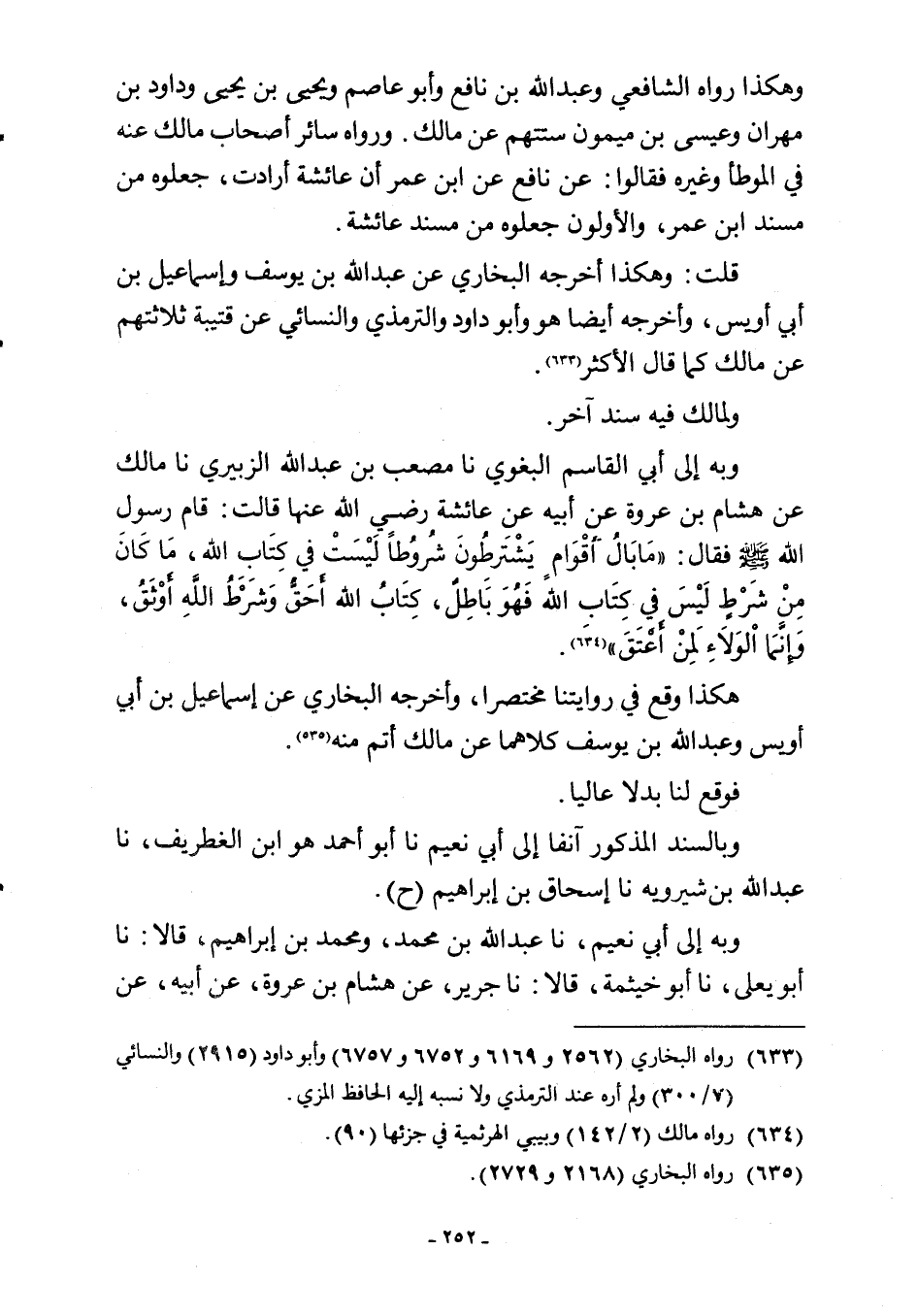 وهكذا رواه الشافعي وعبد اللَّه بن نافع وأبو عاصم ويحيى بن يحيى وداود بن مهران وعيسى بن ميمون ستتهم عن مالك. ورواه سائر أصحاب مالك عنه في الموطأ وغيره فقالوا: عن نافع عن ابن عمر أن عائشة أرادت، جعلوه من مسند ابن عمر، والأولون جعلوه من مسند عائشة.