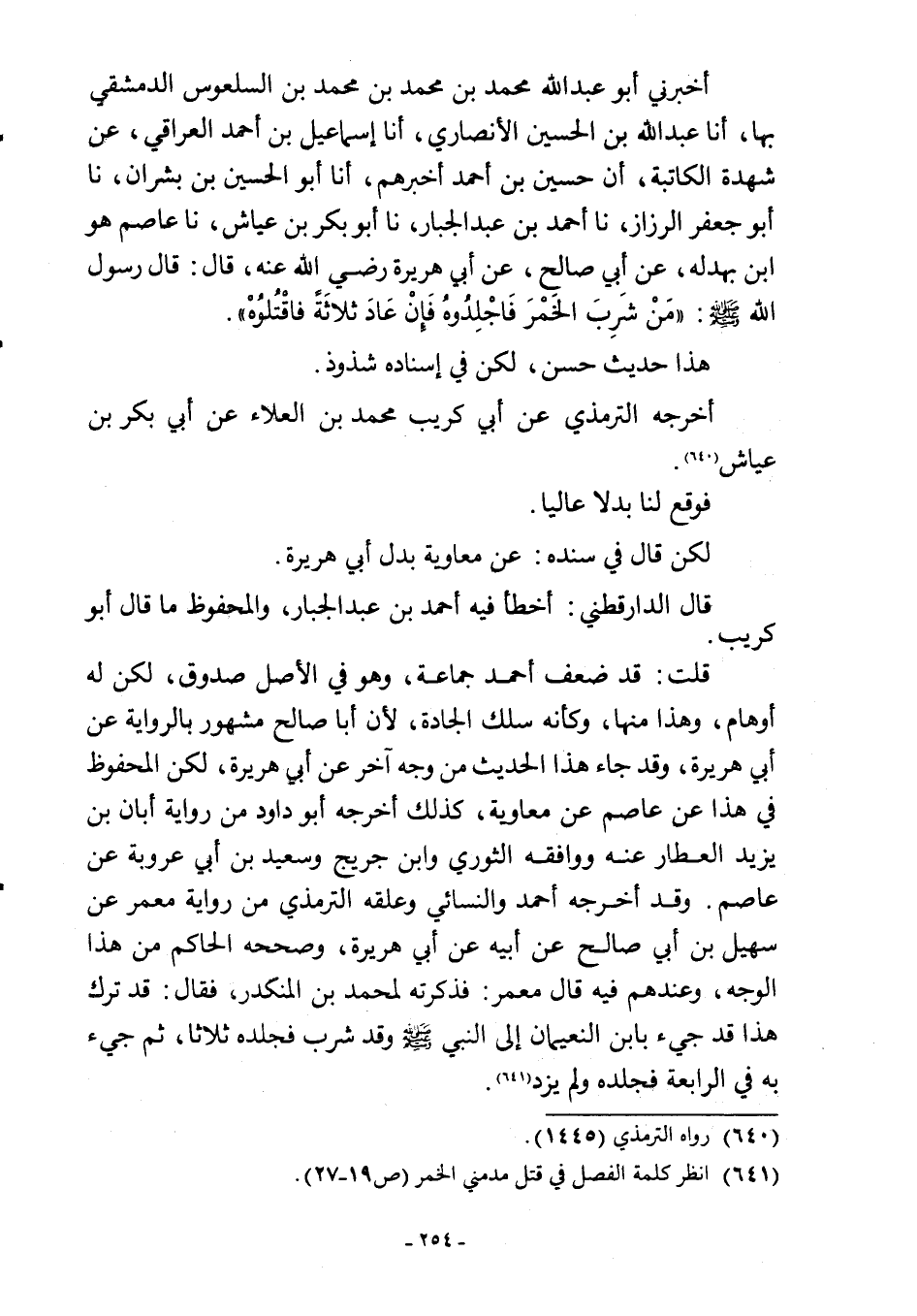 أخبرني أبو عبد اللَّه محمد بن محمد بن محمد بن السلعوس الدمشقي بها، أنا عبد اللَّه بن الحسين الأنصاري، أنا إسماعيل بن أحمد العراقي، عن شهدة الكاتبة، أن حسين بن أحمد أخبرهم، أنا أبو الحسين بن بشران، نا أبو جعفر الرزاز، نا أحمد بن عبد الجبار، نا أبو بكر بن عياش، نا عاصم هو ابن بهدله، عن أبي صالح، عن أبي هريرة رضي اللَّه عنه، قال: قال رسول اللَّه -صلى اللَّه عليه وسلم-: "مَنْ شَرِبَ الخَمْرَ فَاجْلِدُوهُ فَإنْ عَادَ ثَلاثَةً فاقْتُلوُهْ".