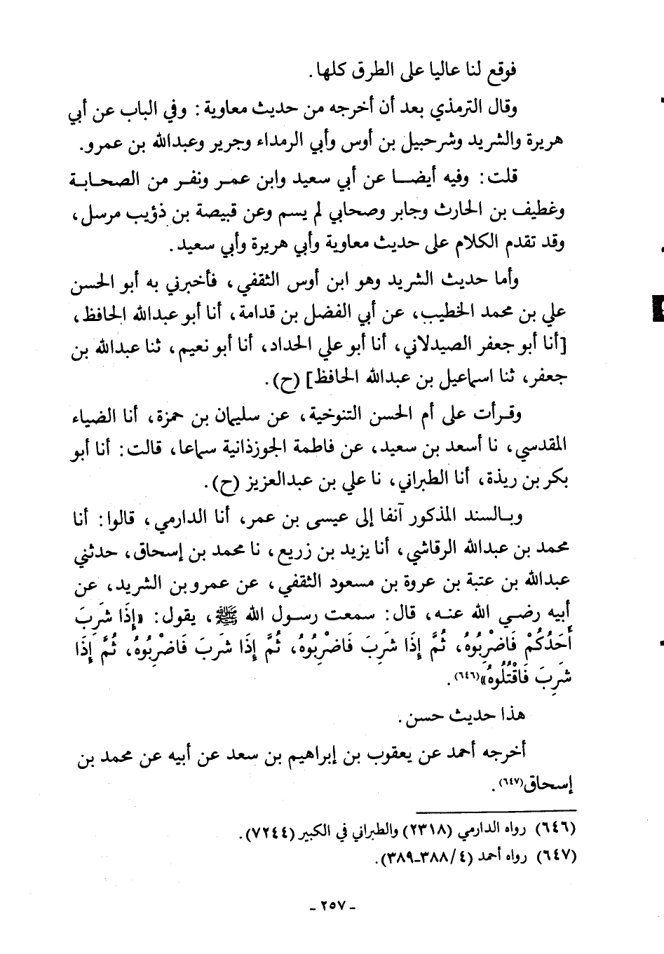 وبالسند المذكور آنفا إلى عيسى بن عمر، أنا الدارمي، قالوا: أنا محمد بن عبد اللَّه الرقاشي، أنا يزيد بن زريع، نا محمد بن إسحاق، حدثني عبد اللَّه بن عتبة بن عروة بن مسعود الثقفي، عن عمرو بن الشريد، عن أبيه رضي اللَّه عنه، قال: سمعت رسول اللَّه -صلى اللَّه عليه وسلم-، يقوله: "إِذَا شَرِبَ أَحَدُكُمْ فَاضْرِبُوهُ، ثُمَّ إِذَا شَرِبَ فَاضْرِبُوهُ، ثُمَّ إِذَا شَربَ فَاضْربُوهُ، ثُمَّ إِذَا شَرِبَ فَاقْتُلُوهُ" (¬646).