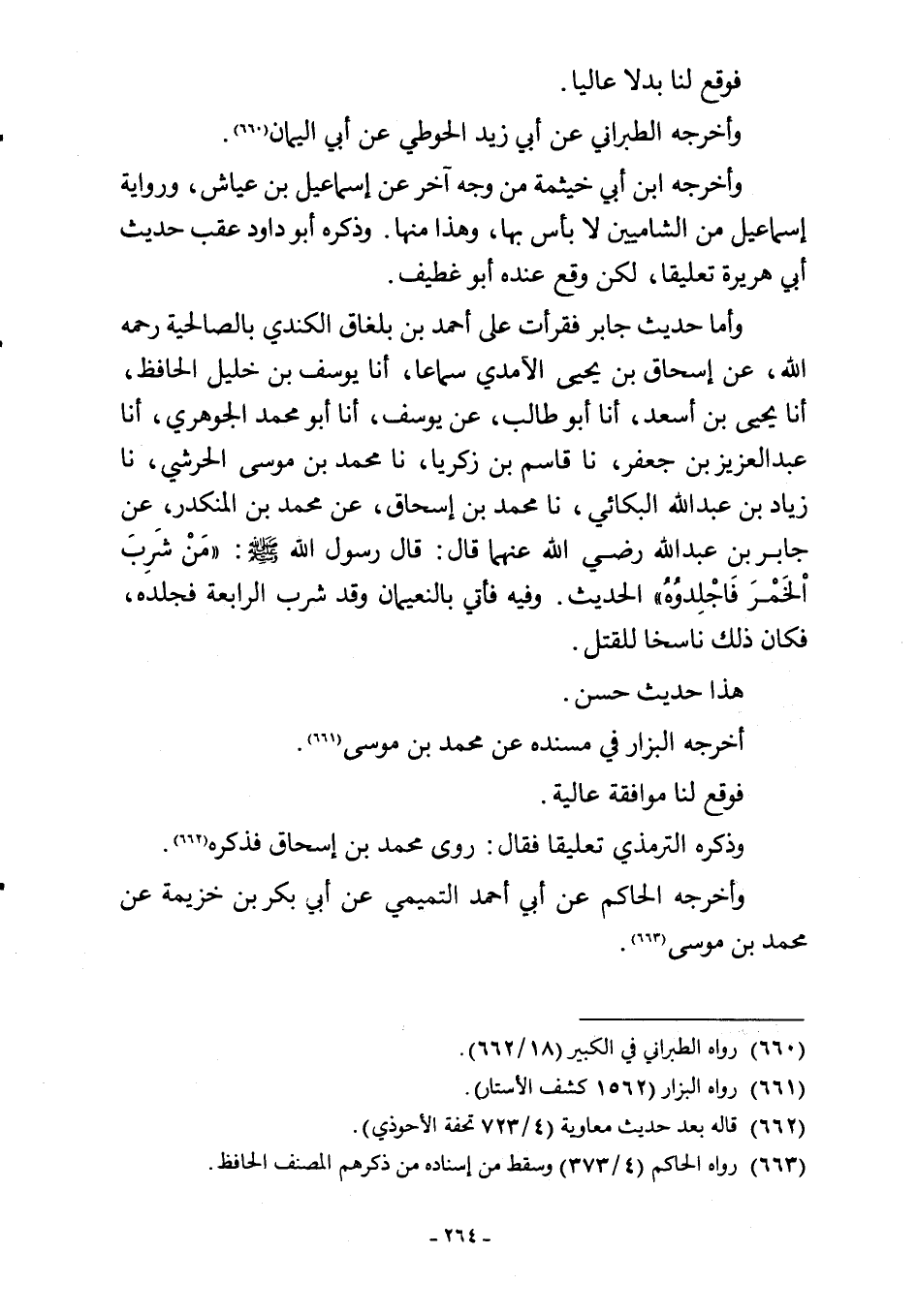 وأما حديث جابر فقرأت على أحمد بن بلغاق الكندي بالصالحية رحمه اللَّه، عن إسحاق بن يحيى الأمدي سماعا، أنا يوسف بن خليل الحافظ، أنا يحيى بن أسعد، أنا أبو طالب، عن يوسف، أنا أبو محمد الجوهري، أنا عبد العزيز بن جعفر، نا قاسم بن زكريا، نا محمد بن موسى الحرشي، نا زياد بن عبد اللَّه البكائي، نا محمد بن إسحاق، عن محمد بن المنكدر، عن جابر بن عبد اللَّه رضي اللَّه عنهما قال: قال رسول اللَّه -صلى اللَّه عليه وسلم-: "مَنْ شرِبَ الخَمْرَ فَاجْلِدوُهُ" الحديث. وفيه فأتي بالنعيمان وقد شرب الرابعة فجلده، فكان ذلك ناسخًا للقتل.